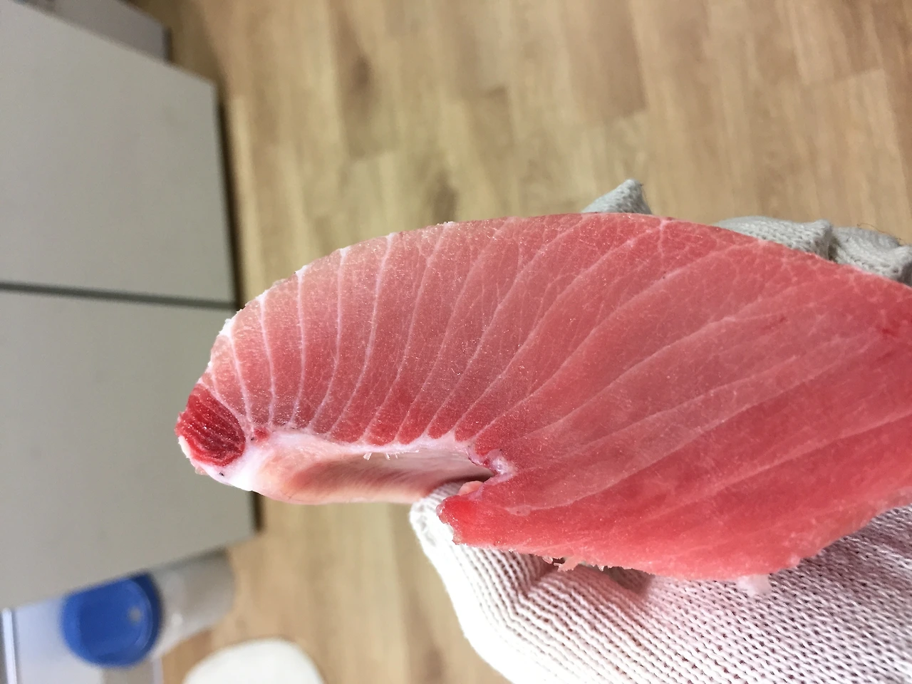안 쪽엔 내장을 감싸는 피막이 있는데 어떤 참치 후기들을 보면 저 부분을 먹는 분들이 있다. 저건 잘라내서 버려야 한다 ㅠ.ㅠ 내장을 감싸는 부위이기 때문에 위생상으로도 좋지 않고 엄청 질기기 때문에 먹기 힘들다.