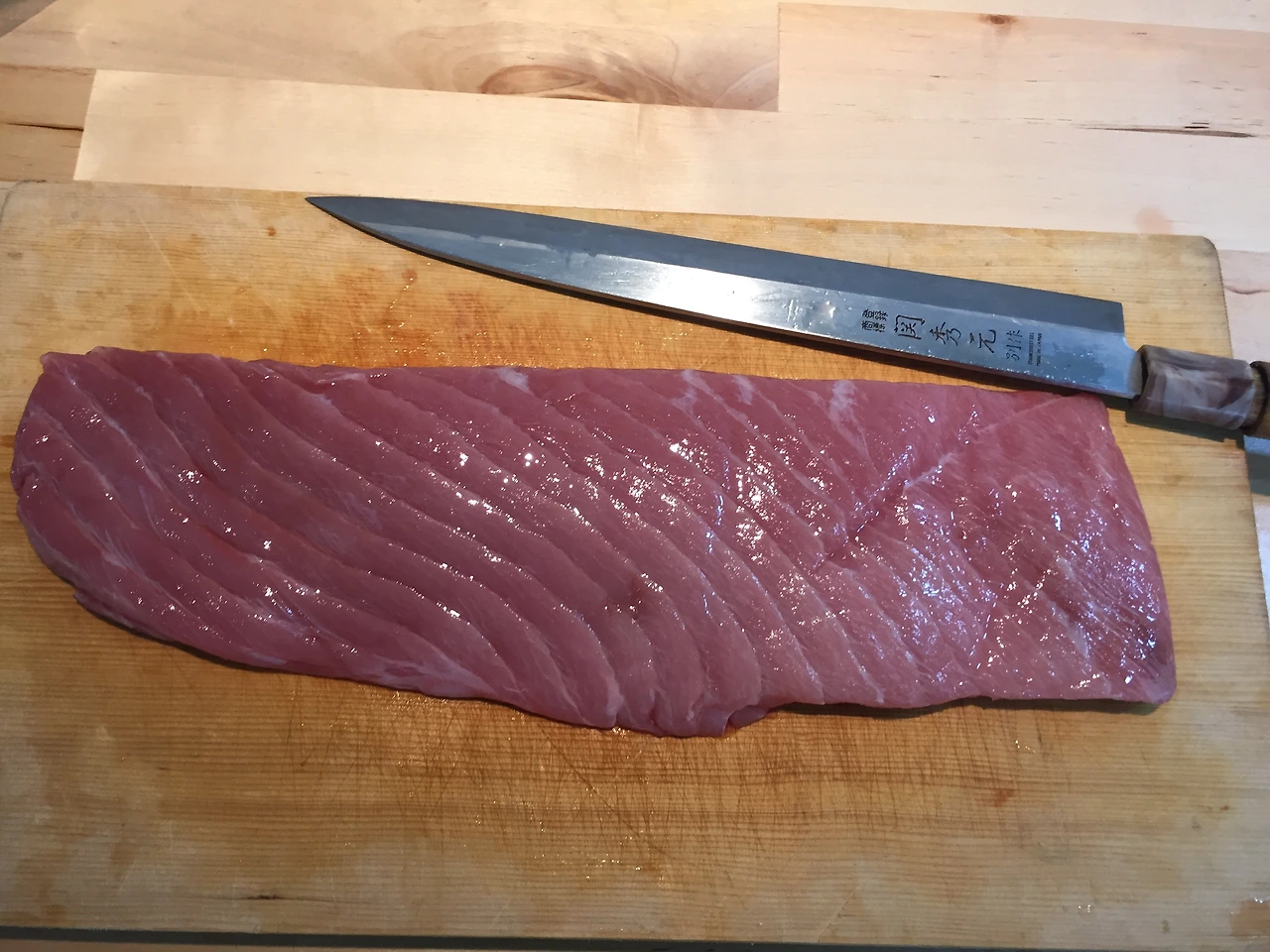 꺼내 본 황다랑어 뱃살이다. 가마부위에서 뒷뱃살까지 모두 있는 걸로 봐서 어체가 작은 편임을 알 수 있다. 국내 수급이라 그런 걸까? 좀 더 큰 어체였으면 맛이 더 좋았을 것 같은 아쉬움이 남지만 그러면 가격이 더 비싸지겠지.