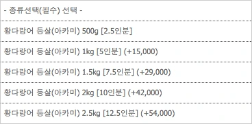 이 쇼핑몰은 황다랑어만 판매한다. 쇼핑몰에 전화해서 물어보았는데, 참다랑어는 취급 계획이 없고 눈다랑어는 추후에 취급할 예정이라고 한다. 아무래도 고가의 참다랑어는 수급도 쉽지 않고 구매자도 많지 않을 거라서 취급하지 않는 것 같다.