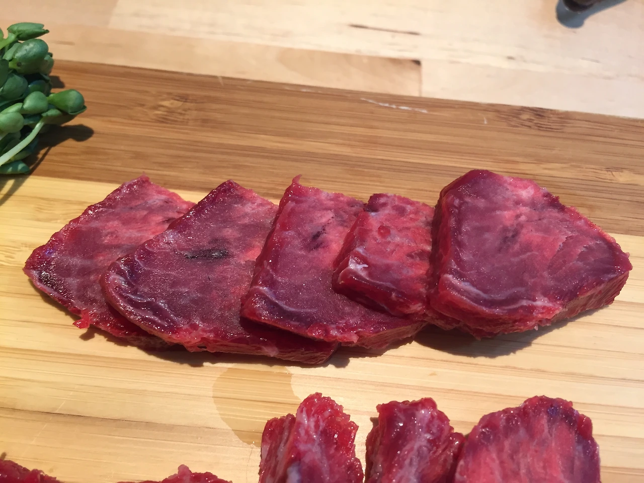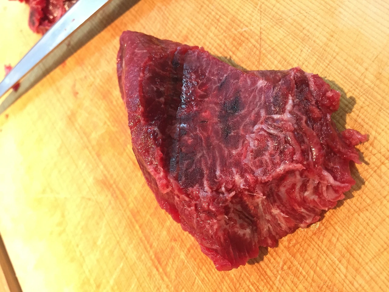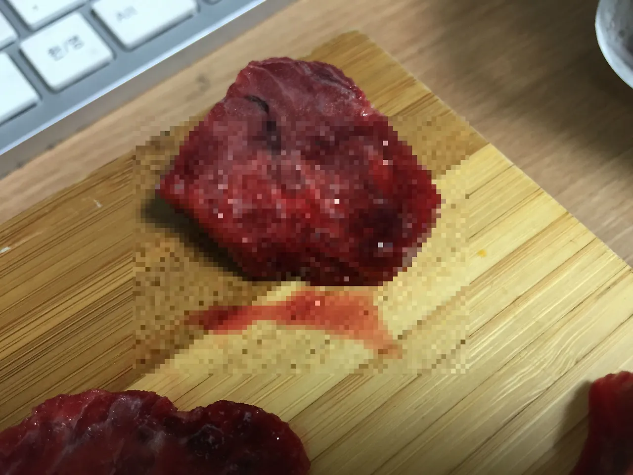 어쨌든 최대한 빨리 먹어치워야겠다고 생각하고 작은 도마 위에 썰어내었다. 중간중간 피가 뭉쳐있는 게 보인다.