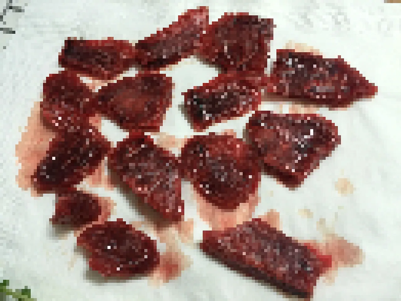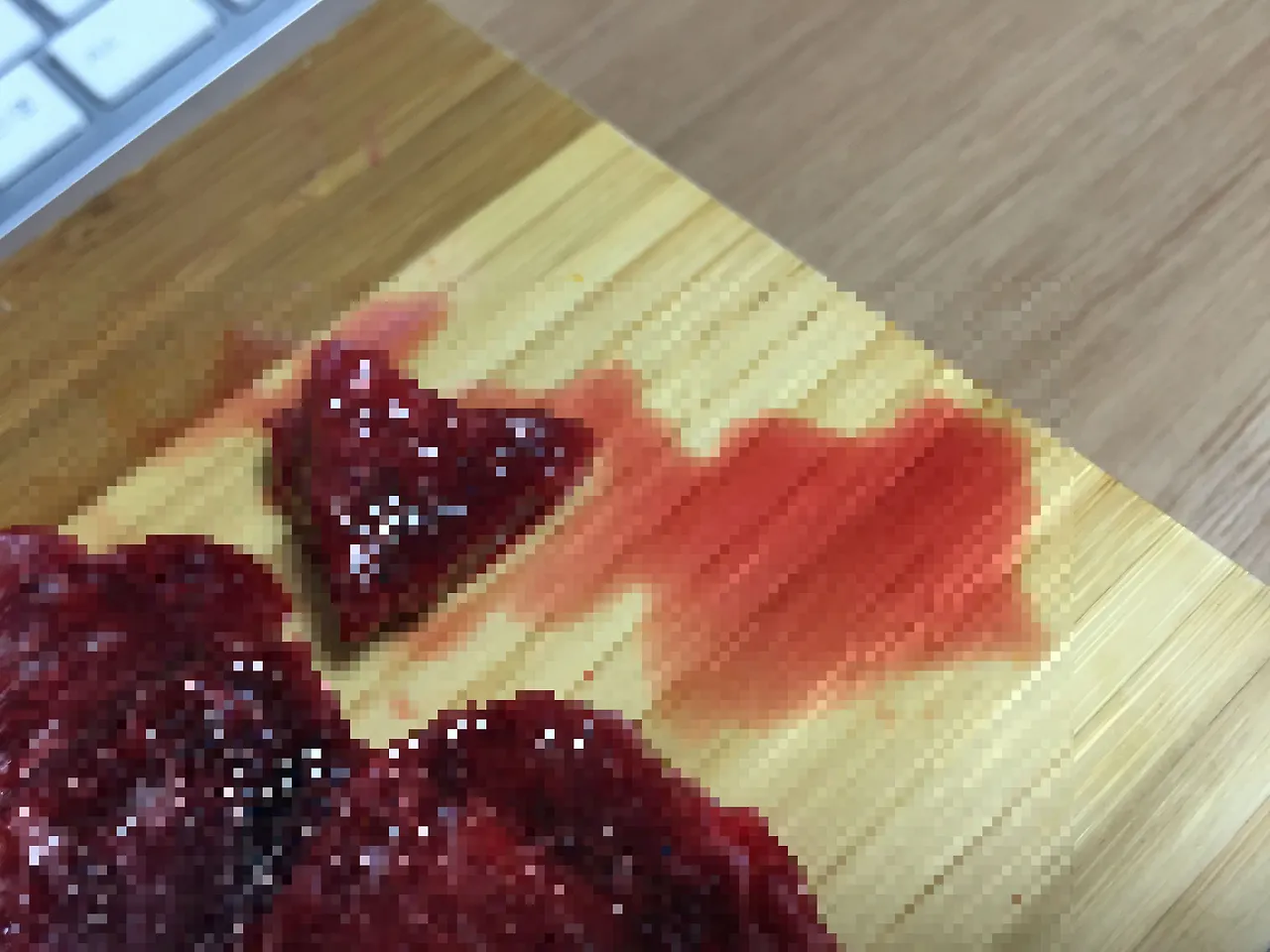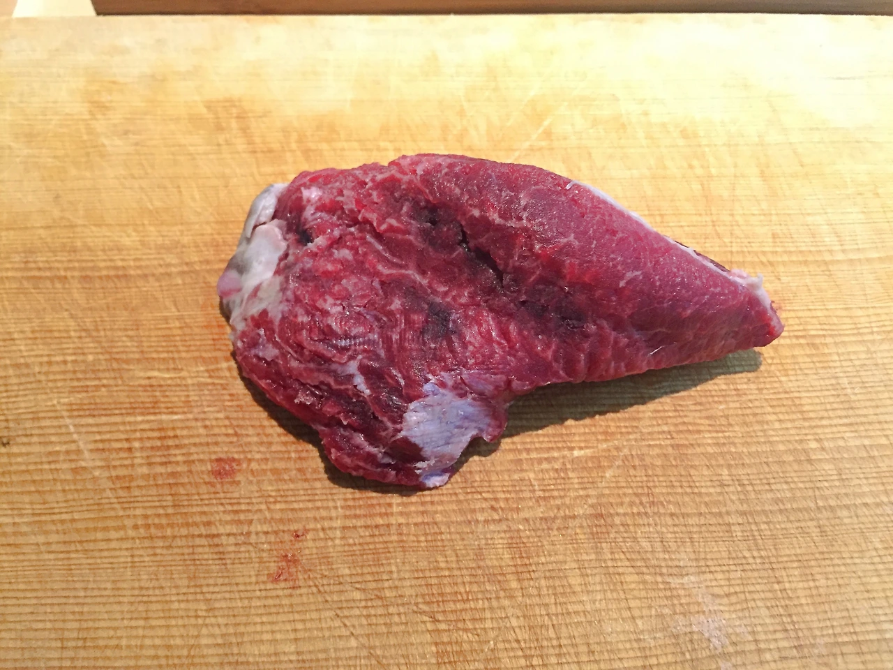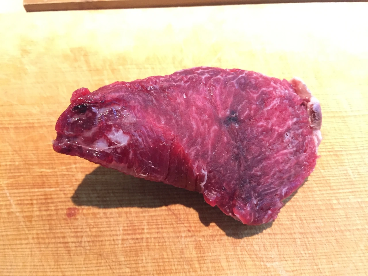 어쨌든 최대한 빨리 먹어치워야겠다고 생각하고 작은 도마 위에 썰어내었다. 중간중간 피가 뭉쳐있는 게 보인다.