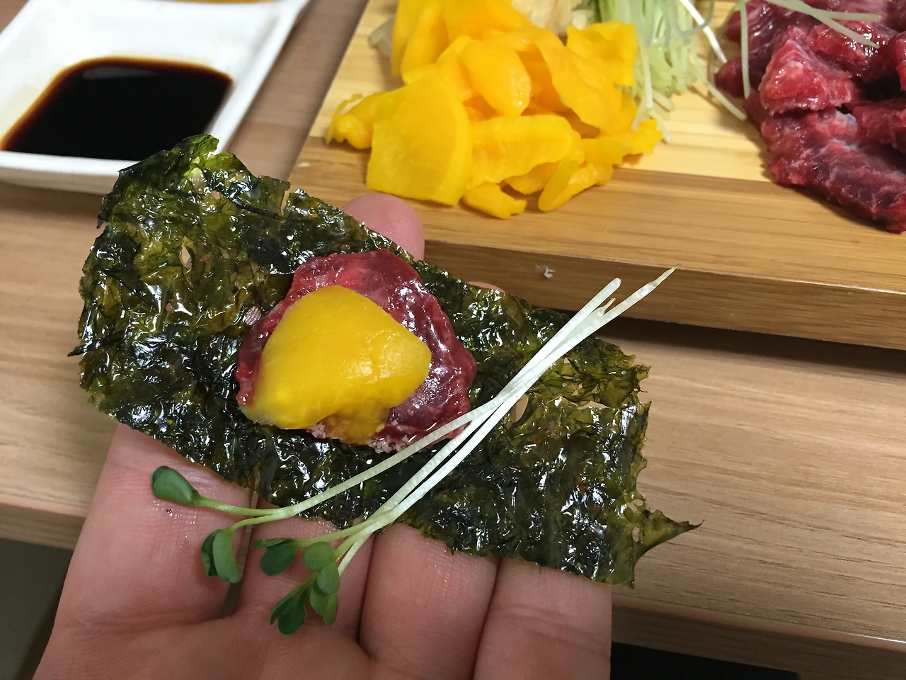 김과 치자 단무지를 곁들여 피비린맛을 최대한 감추고, 기름소금을 찍어 먹는다.