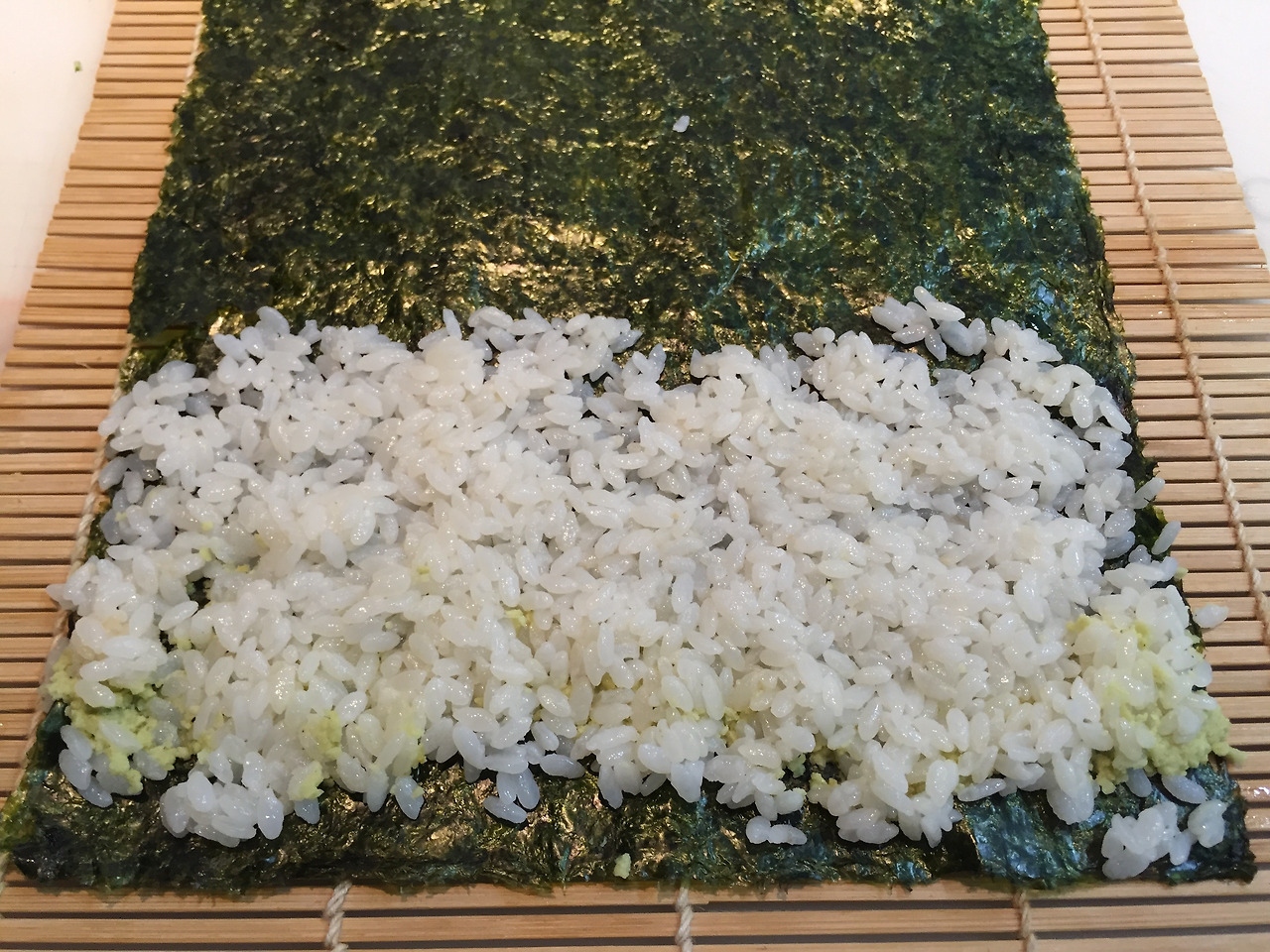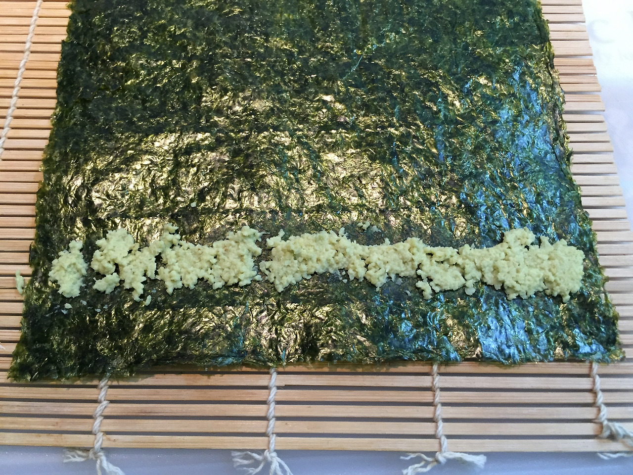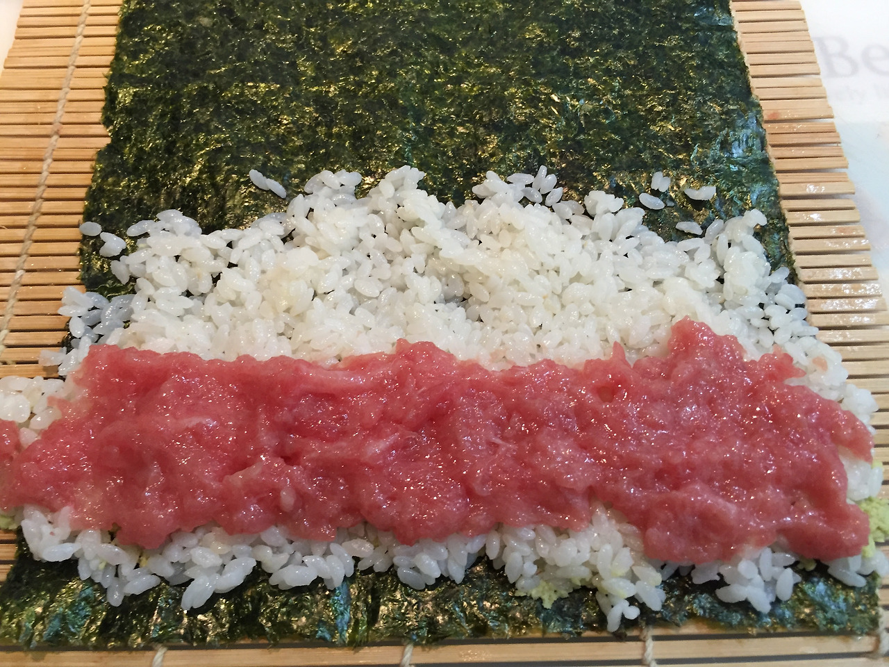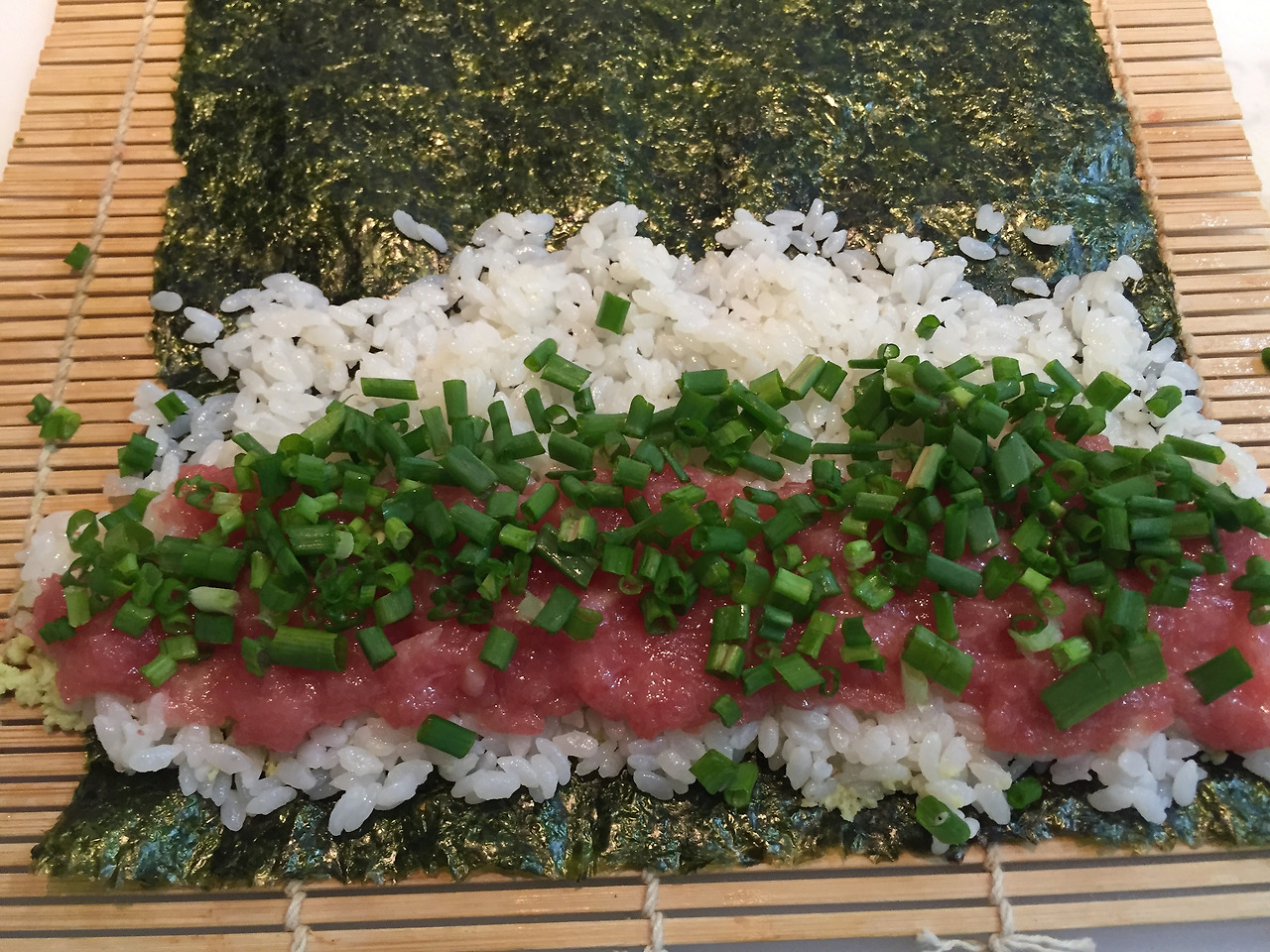 와사비를 김에 바르고 밥을 골고루 붙여준다. 위에 참치회와 파를 듬뿍 올려주면 된다.