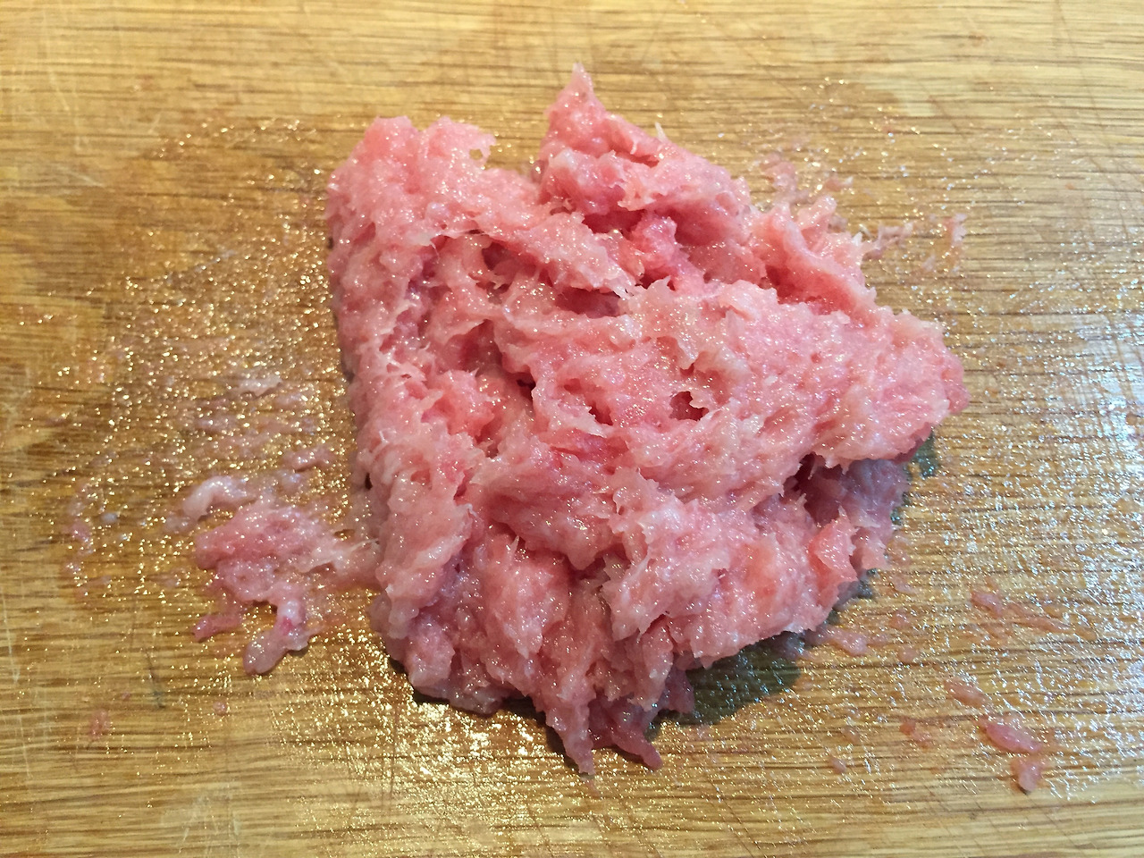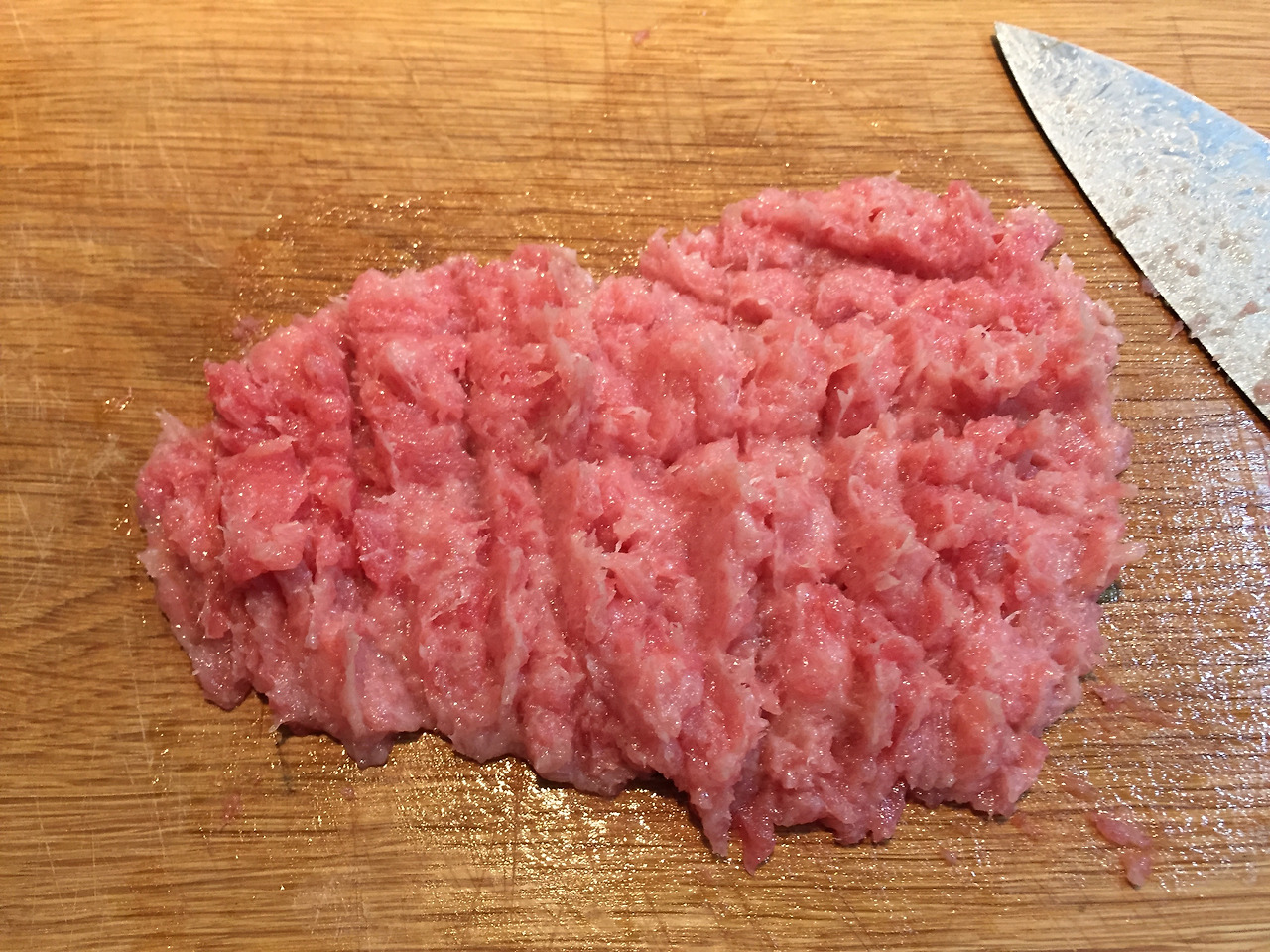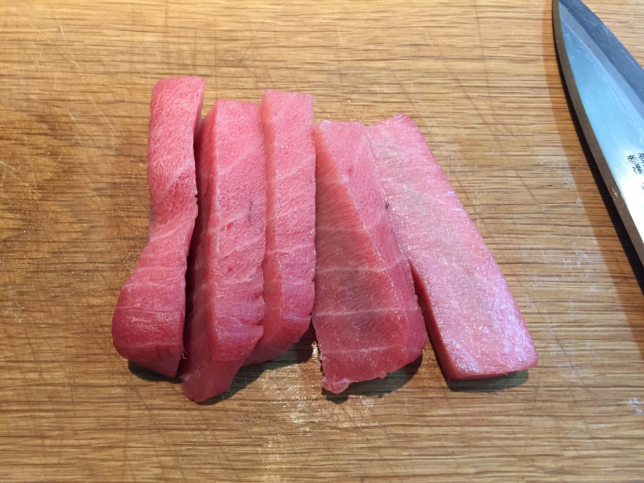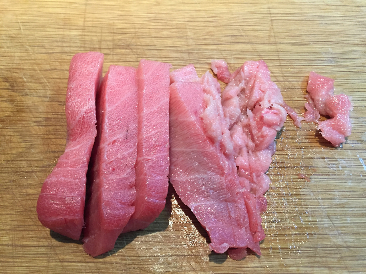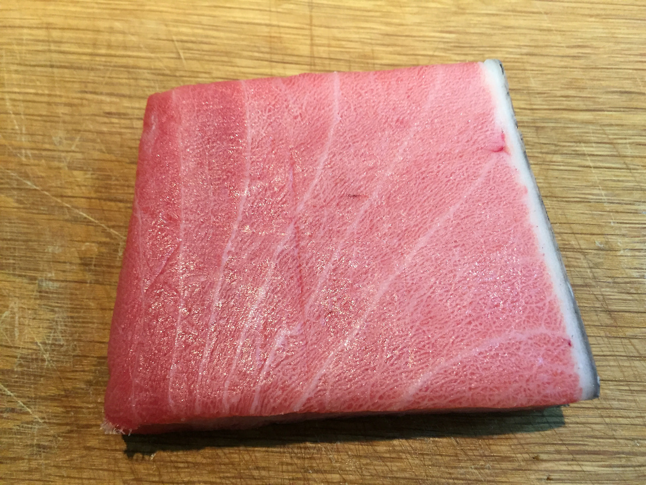 참치를 준비한다. 참다랑어 No.3 뒷뱃살이다. 가격은 100g에 1만 원 정도. 사진은 약 200g 정도이다. 참다랑어 뱃살은 풍부한 지방으로 인해 매우 부드럽고 느끼하다.