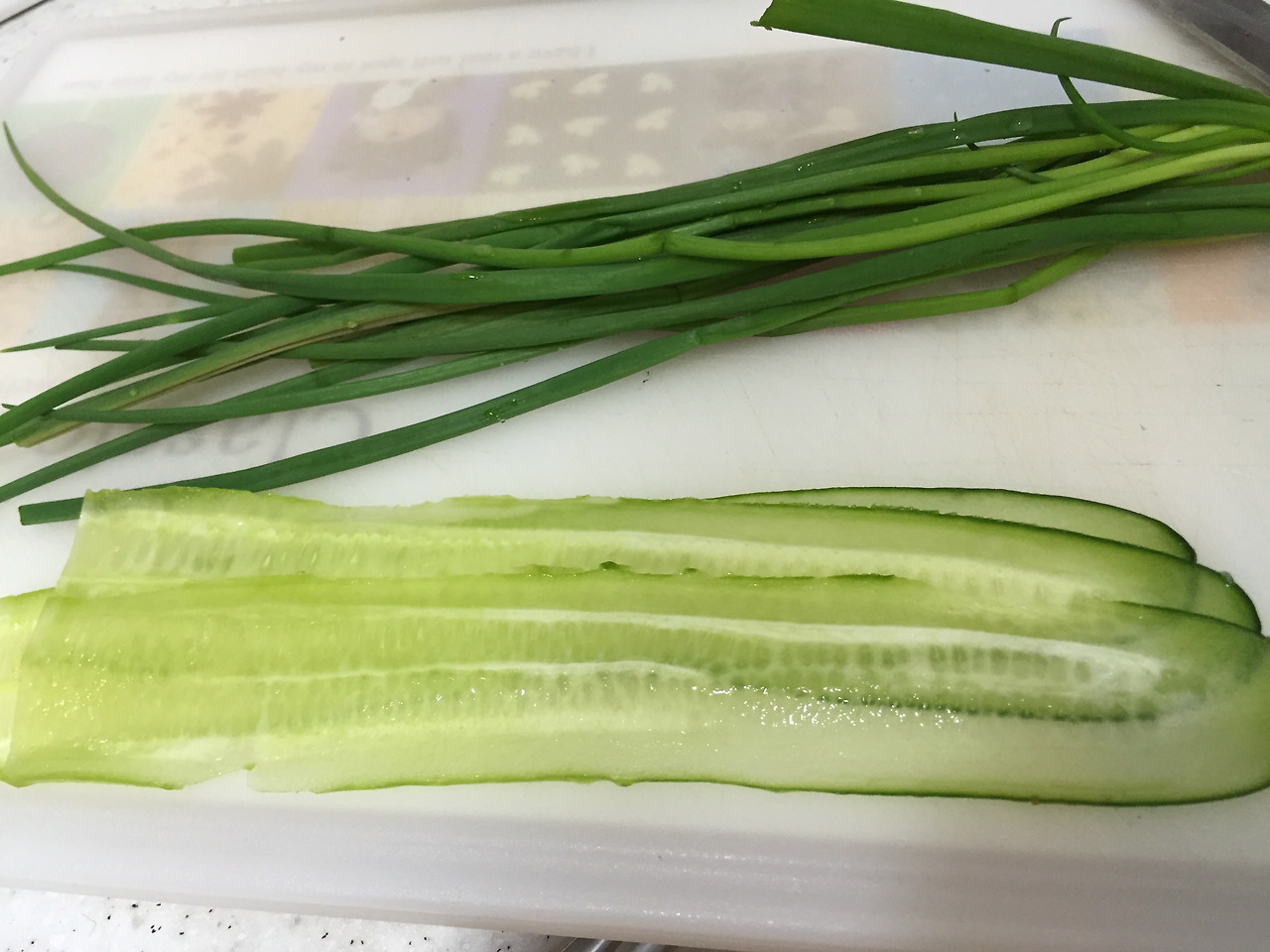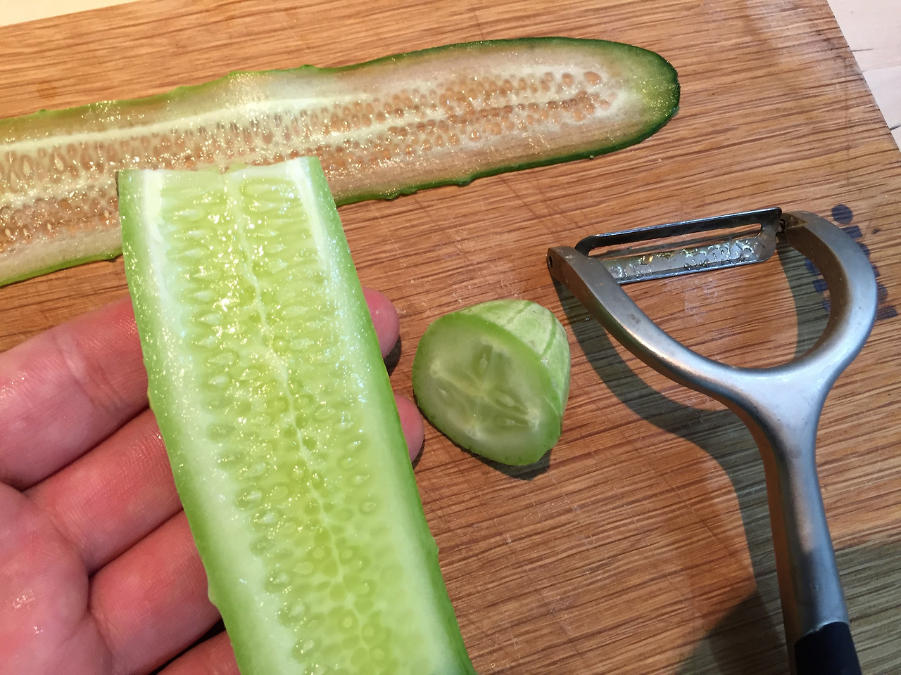 군함에 쓰일 오이를 준비한다. 오이는 반 자른 후 감자 깎기로 발라내면 군함말이에 감쌀 얇은 오이를 얻을 수 있다.