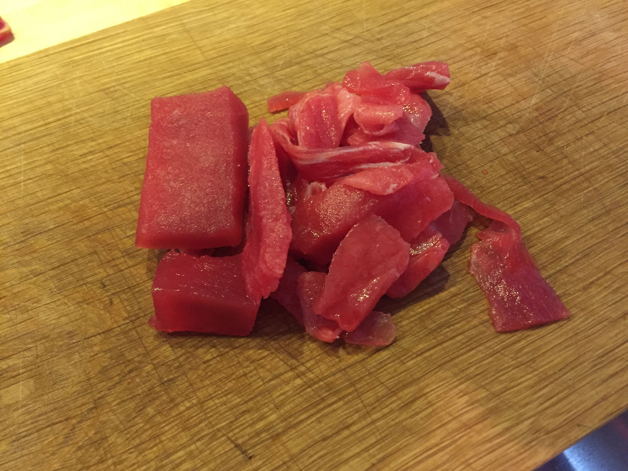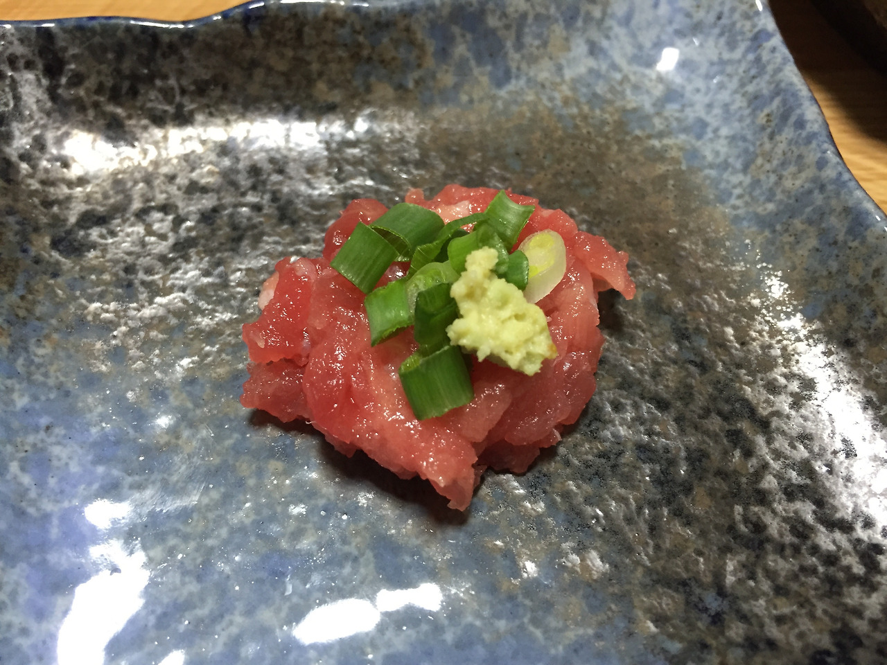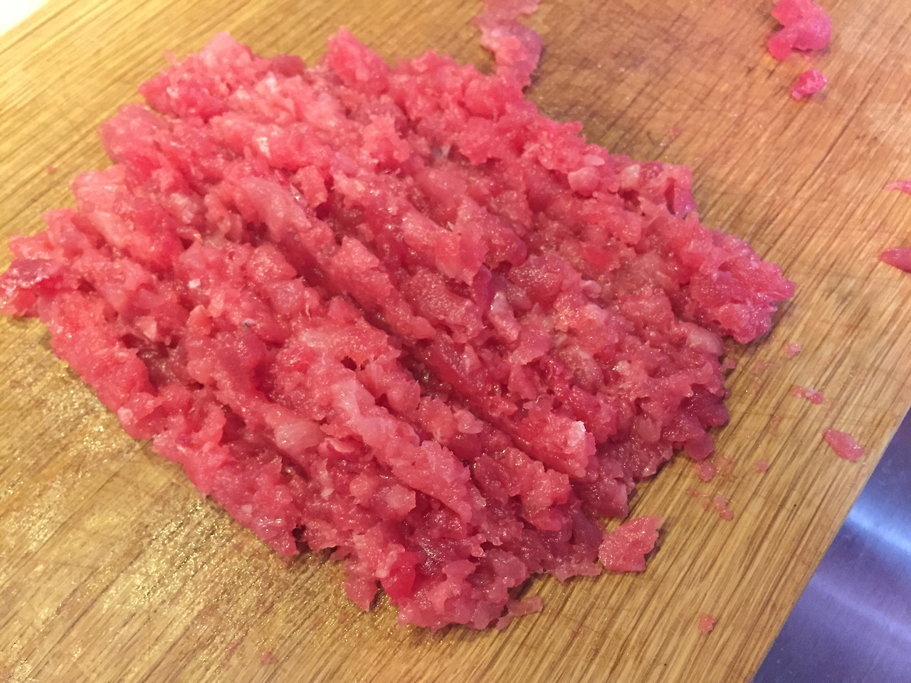 이 방법은 김말이나 군함으로 만들어 먹는 네기도로를 만드는 것과 비슷하다.(파와 참치의 조화, 네기도로 글 참조) 네기도로는 뱃살로 만들기 때문에 부드럽게 다질 수 있지만, 지금은 이런저런 부위가 섞여 있기 때문에 뱃살만큼 부드럽게 되지는 않는다. 약간 씹히는 식감이 있을 수 있다.