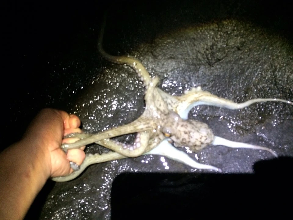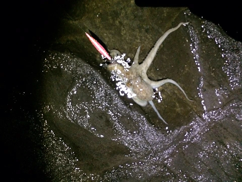 '에기'라고 부르는 새우 모양의 가짜 미끼를 사용해서 에깅 낚시라고 부르는데, 주로 잡히는 건 무늬오징어(위 사진), 화살 오징어, 한치 등이다. 그리고 가끔 에기를 너무 바닥에 내리면 문어가 잡히기도 한다.