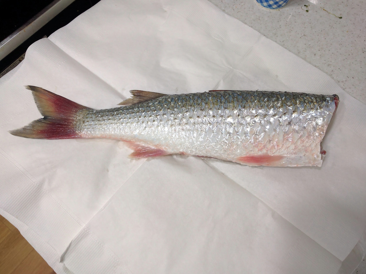 철수할 때 남은 숭어를 어떻게 할까 고민하다 한 마리를 기포기로 살려서 집에 가져왔다.