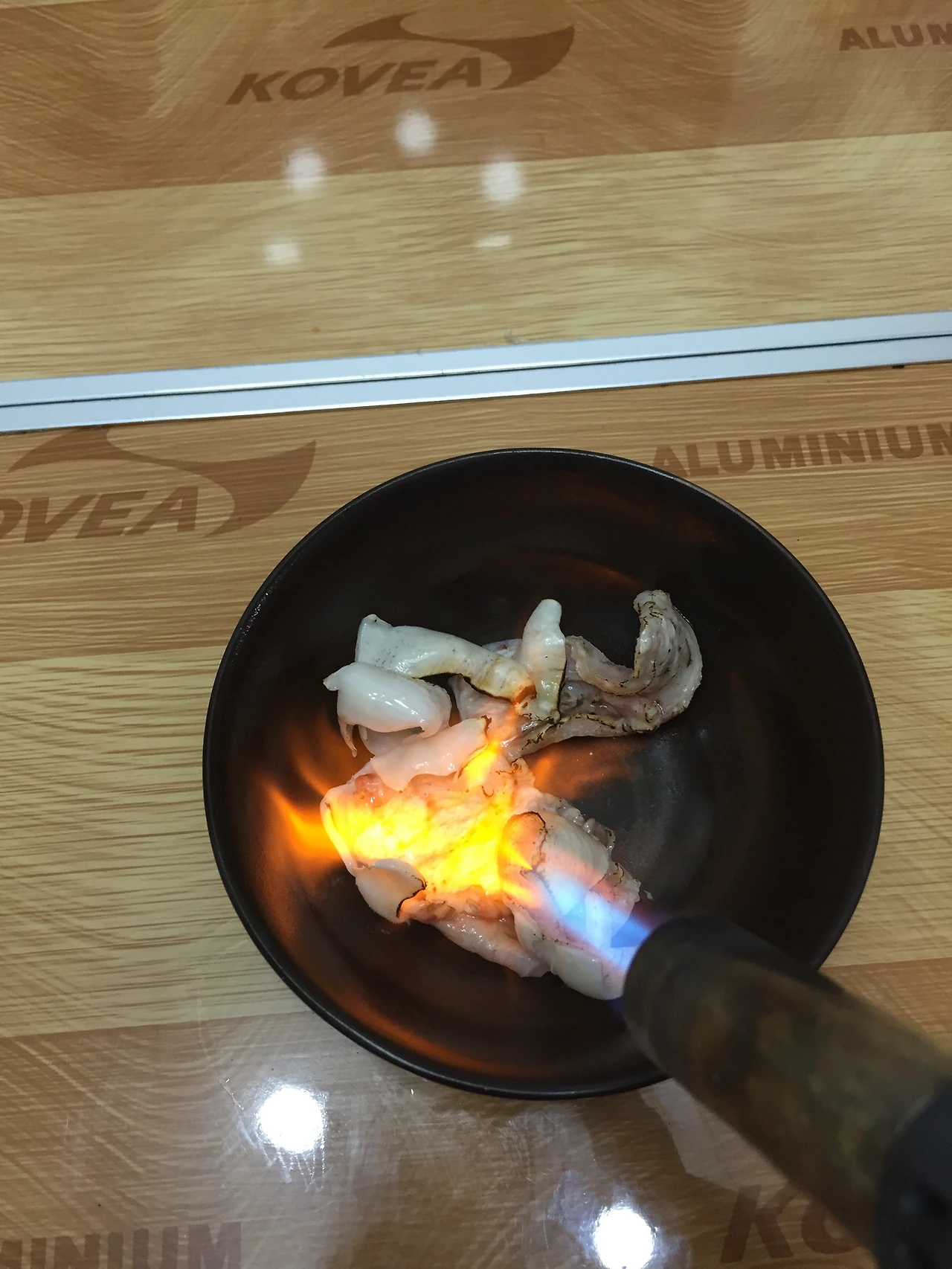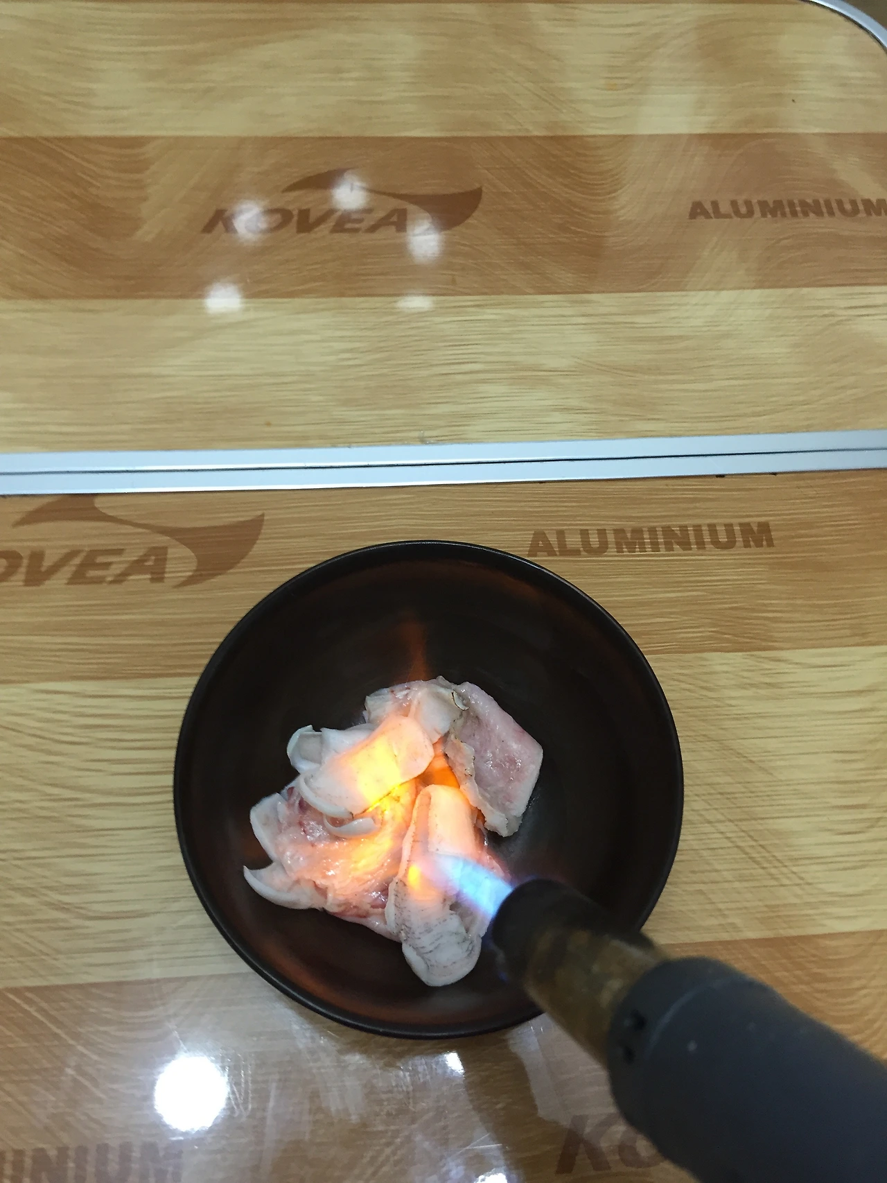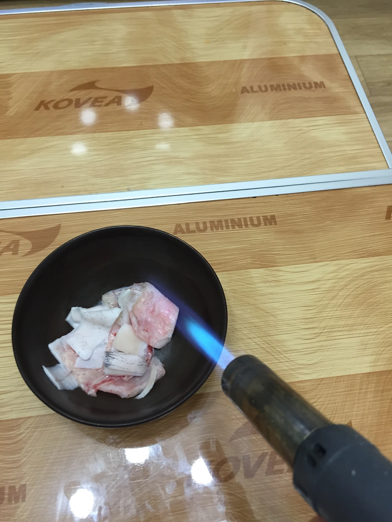 방법은 간단하다. 그냥 토치로 고르게 구워주면 된다. 껍질의 경우 얇아서 쉽게 타기 때문에 중간중간 젓가락으로 휘저어가며 고르게 익도록 해준다. 별도의 간은 필요 없이 자체만으로도 짭조름한 맛이 난다. 기름기가 많이 흘러나오는데 이 부분은 키친타월로 어느 정도 기름기를 뺀 후 그릇에 담아내는 게 좋다.