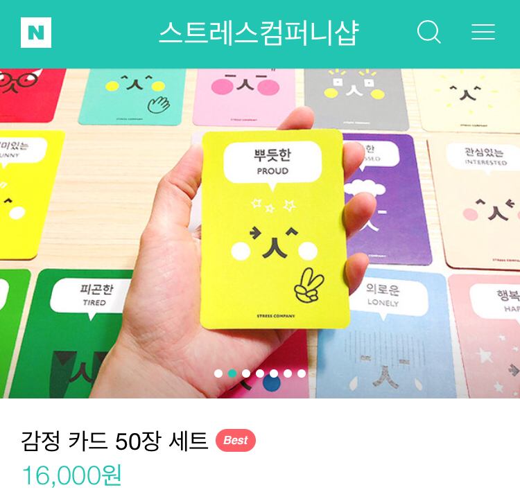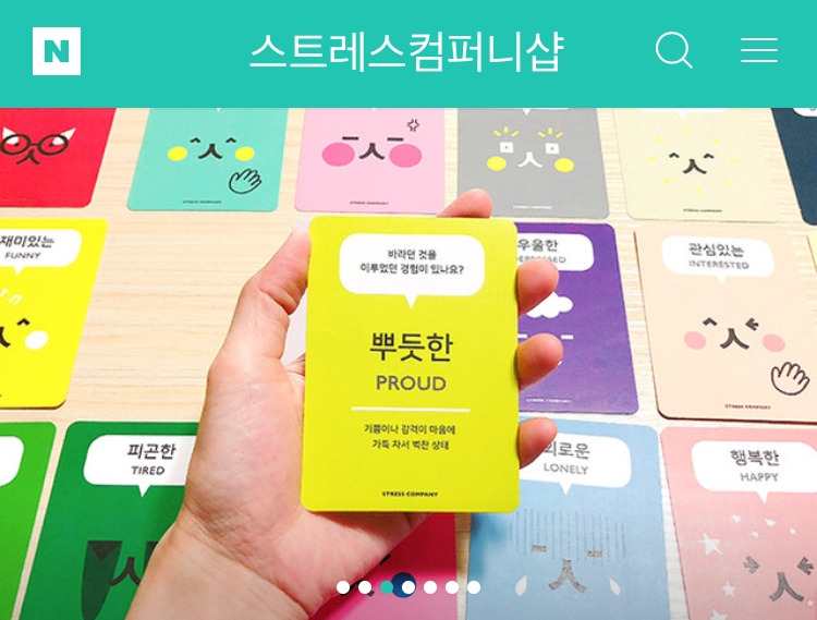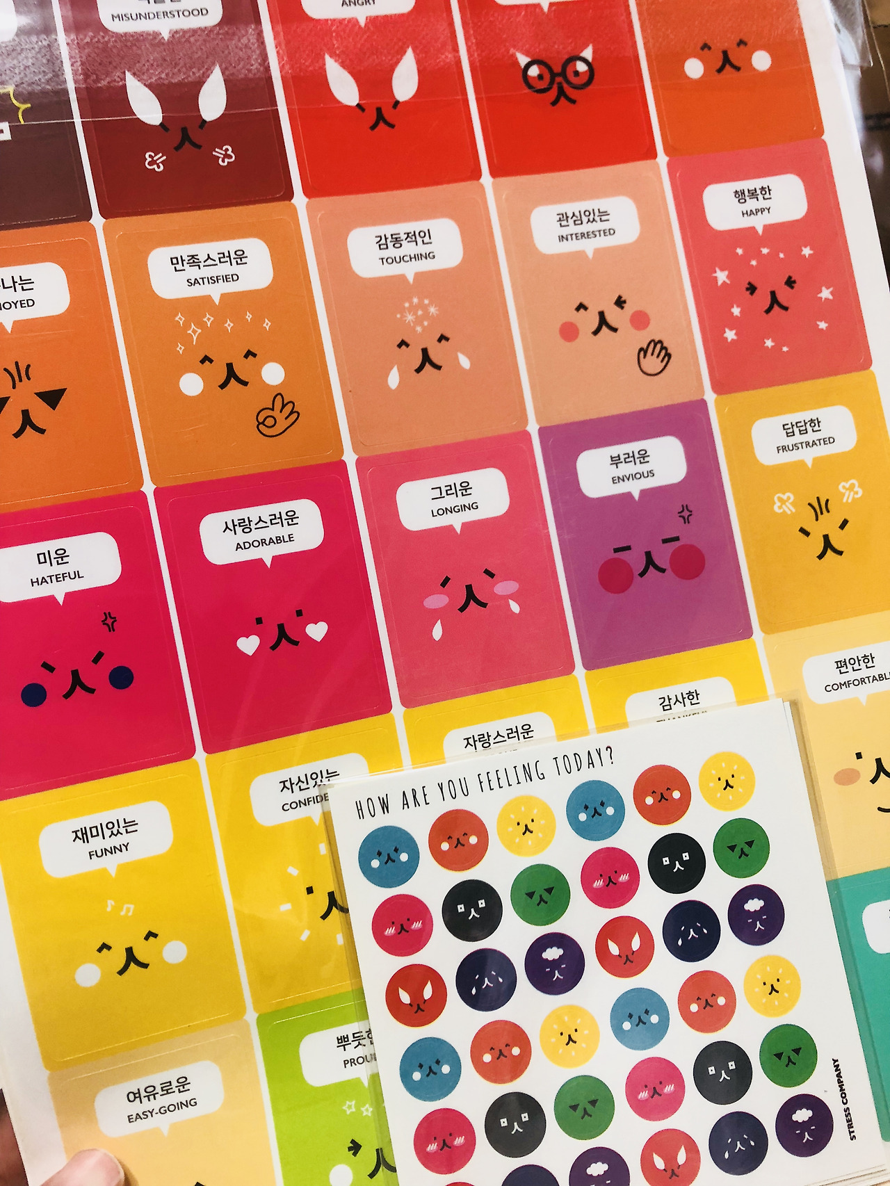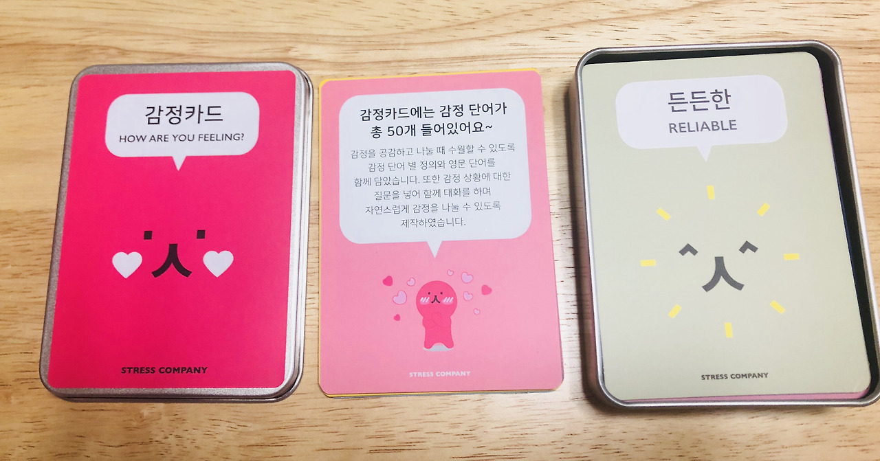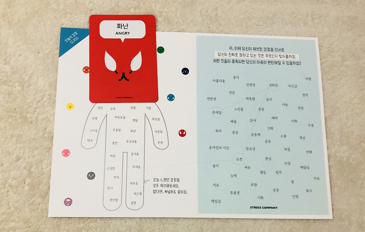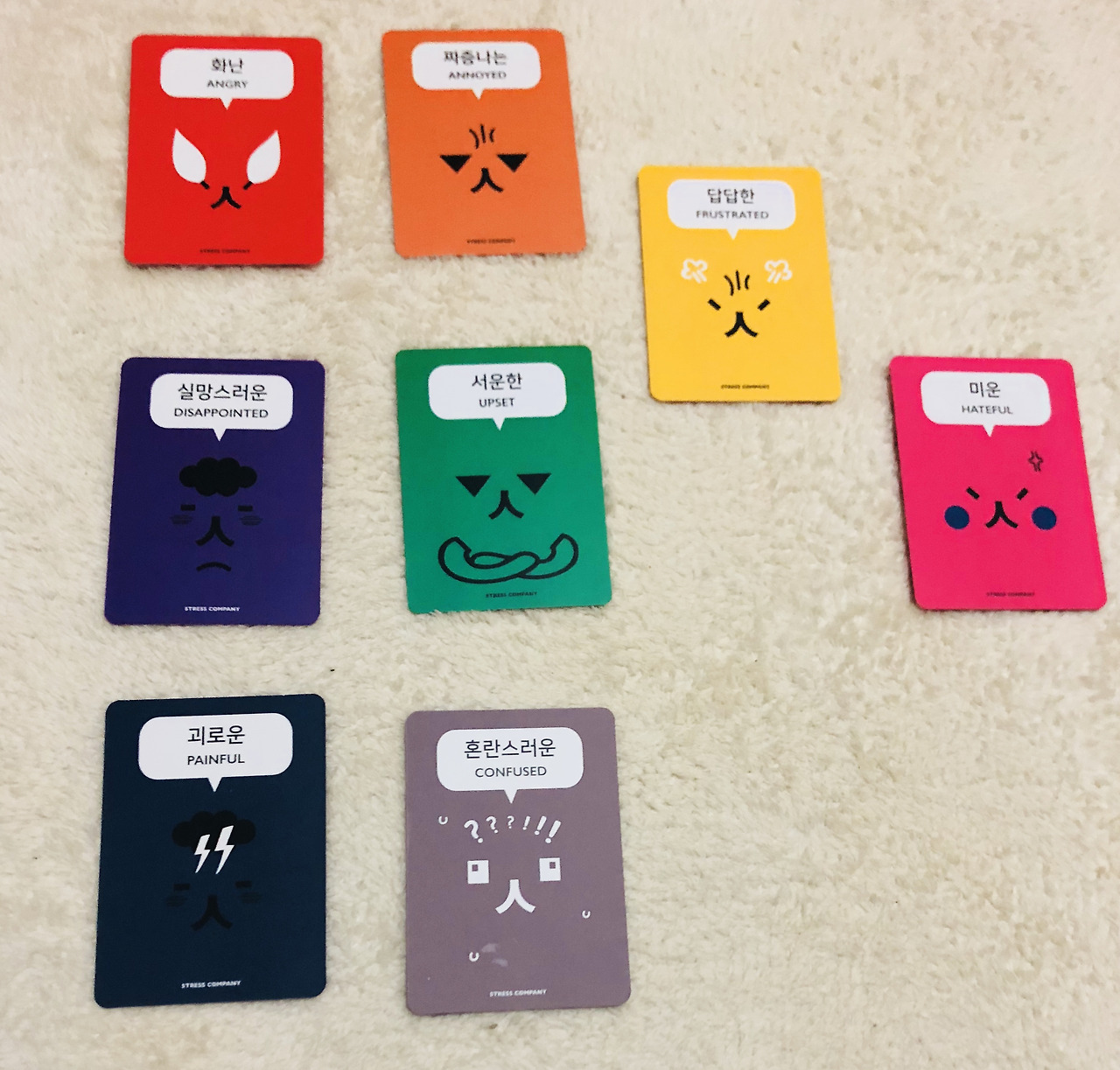감정 단어를 찾다 보니 나 같은 사람들을 위한 감정카드가 있단 것도 알게 됐다. 인터넷으로 이런저런 감정카드를 검색하다 보니 눈에 띄는 구매처가 있었다. 스트레스 컴퍼니의 감정카드였다. 다른 곳보다 다루는 감정의 종류도 많고, 다양한 색과 단순한 그림으로 표현되어 직관적이었다. 앞면은 단어로 뒷면은 감정이 대한 해설도 되어 있어 헷갈리는 부분도 명확하게 볼 수 있을 것 같았다. 무엇보다도 귀여운 게 가장 마음에 들었다.