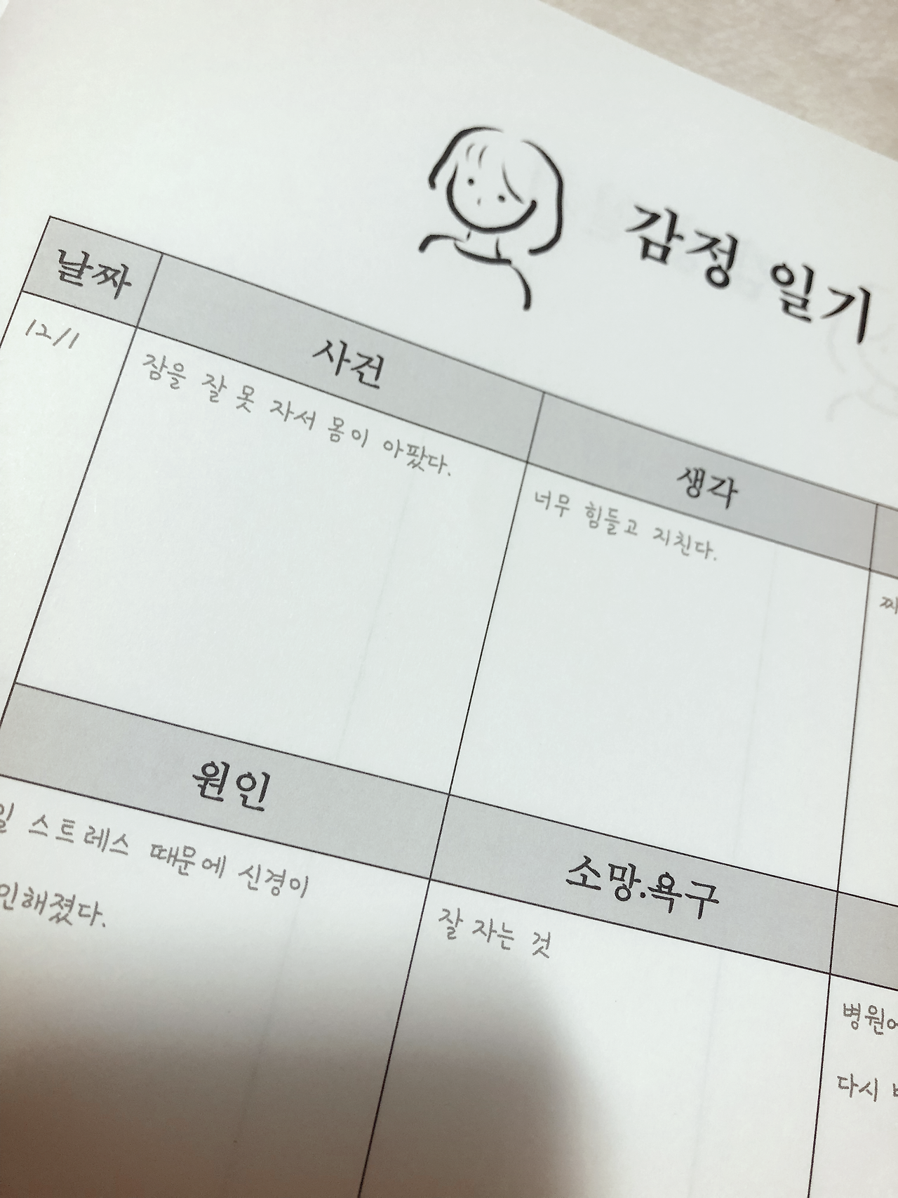 다시 감정일기를 펼쳤다. 감정일기에는 여섯 가지 칸이 있는데 아직 원인이나 행위 선택과 같은 칸은 채우기가 어려웠다. 사실 무슨 이야기인지 잘 가늠이 되지 않는 부분도 있다. 내가 이런 감정을 가지게 된 원인을 찾아가는 방법도 어렵다. 예전에 일기를 쓰면서도 원인을 알 수 없이 넘어간 적도 많았으니. 행위 선택도 비슷하다. 내 소망이나 욕구를 실현하기 위해서, 그래서 방법이 있나? 나는 존중받고 싶은데, 저 사람은 다음번에도 나를 존중하지 않을 수 있잖아. 저 사람에게 존중받지 않아도 나 스스로 존중하고 치유하려면 어떻게 하면 좋을까.