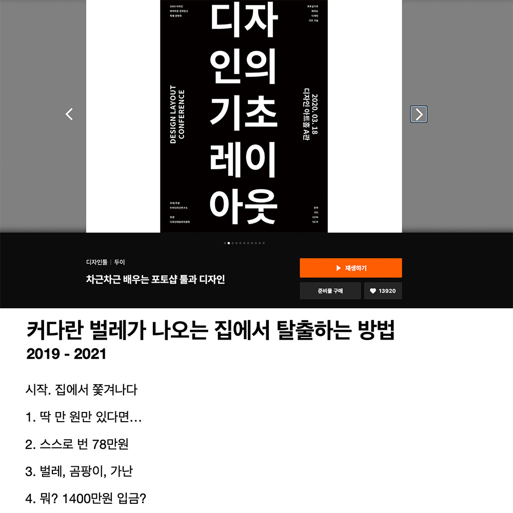 디자인을 예시로 들어보겠다. 최근 나와 같이 메모어에서 강연을 한 디자이너 두이 님의 이야기를 빌려보자면, 두이 님은 일반 문과 학생이었다. 하지만 1점대의 학점으로 용돈이 모두 끊기게 된다. 아르바이트라도 하기 위해 구인구직을 했지만 쉽지 않았고 돈을 벌 수 있을만한 것을 찾기 시작했다. 돈이 없었을 시기여서 돈 버는 강의의 상세페이지와 책만 읽고 대략적인 구조를 파악하셨다고 한다.