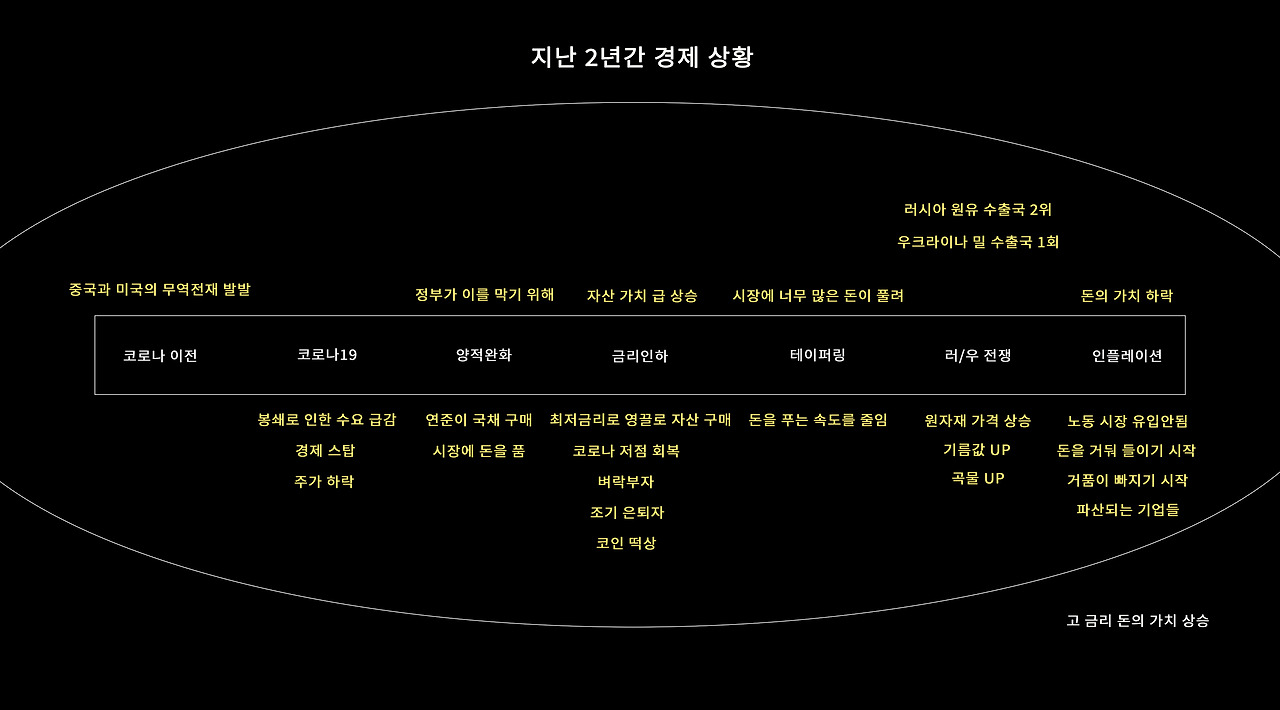 코로나 사태 직 후 코로나를 막기 위하여, 봉쇄를 통해 사람들의 소비가 줄고, 경제가 멈추게 되었다. 기업들이며 , 자영업자며 모두 시장에서 죽어나가기 시작했고 이를 방지하기 위해 정부에서는 간접적 [초 저금리] 직접적 [지원금 명목]으로 시장에 돈을 풀기 시작했다. 이렇게 저금리 상태의 시장에서 사람들이 통장에 넣어두는 것보다 주식, 코인, 부동산 자산을 구매하는 것이 이득이기 때문에 시장에 엄청난 돈이 돌기 시작했다.이러한 상황을 토대로 벼락부자, 코인러들, 조기 은퇴자, 주식부자들이 엄청나게 생겨나기 시작했다. 하지만 1년을 가지 못했고, 경제가 정상적으로 돌아야 하는데, 이미 시장에 돈이 너무 많이 풀려서 돈의 가치가 하락하는 인플레이션이 발생했다. 재도 나도 2~3억은 우습게 벌고 좋은 곳 가고 좋은 차 사고 수요가 많으니 너무 많은 물가가 상승한 것이다.
