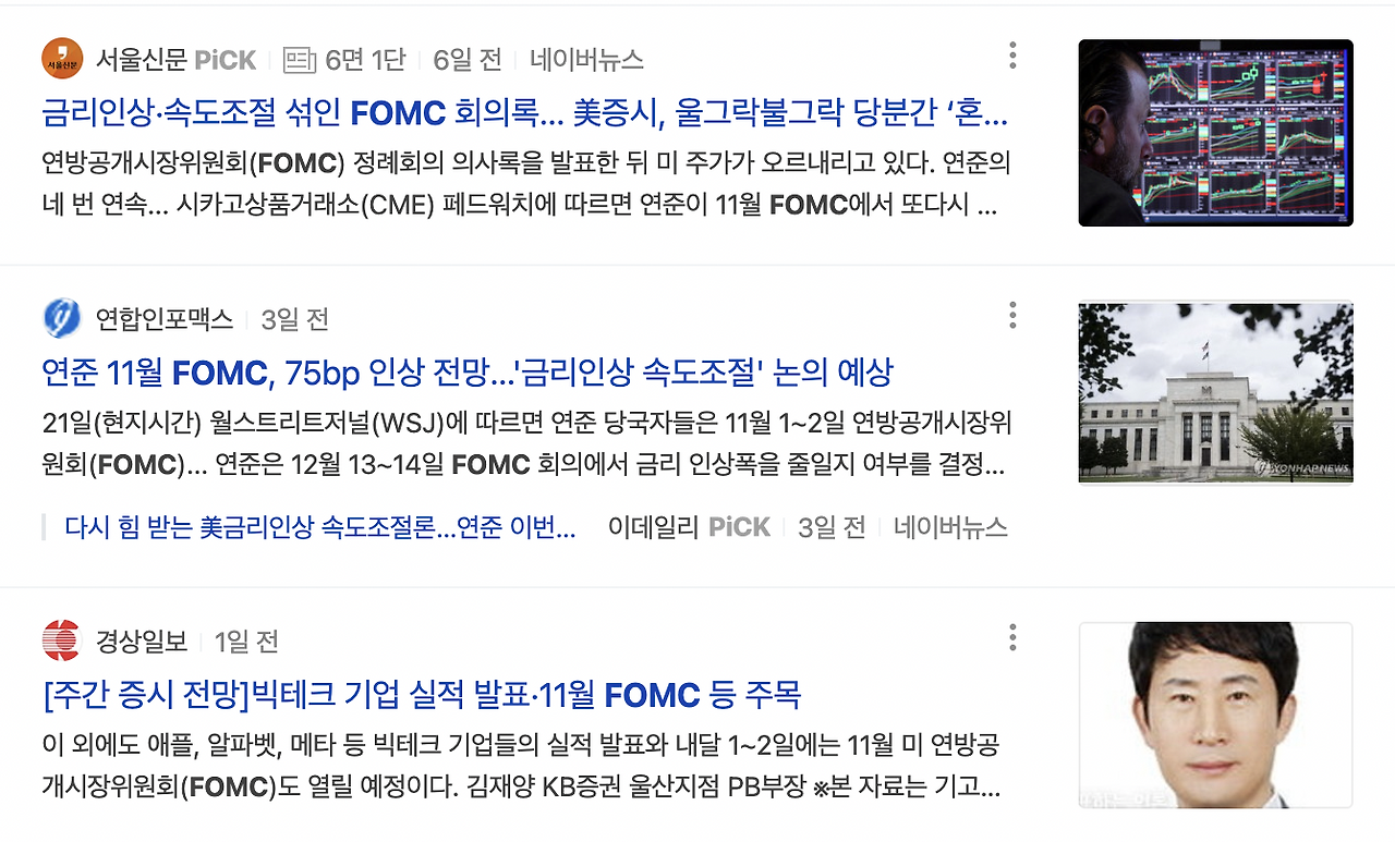 경제정세, 시장의 통화 공급량, 경기전망 등 경기에 대한 내용의 회의를 FOMC에서 진행하며, 회의 결과에 따라 증시에도 많은 영향을 준다. 최근에 발표하는 빅 스텝, 자이언트 스텝, 울트라 스텝 모두 FOMC에서 발표하는 내용이다. 스텝은 언어적 표현이고 0.5bp , 0,75pb, 1pb를 말하며 최근에는 자이언트 스텝 0.75pb를 잇달아 3번 상승 중이다. 이러한 이유로 FOMC는 45일에 한 번씩 일 년에 총 8번이 열리며, 이때마다 증시에