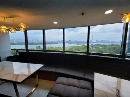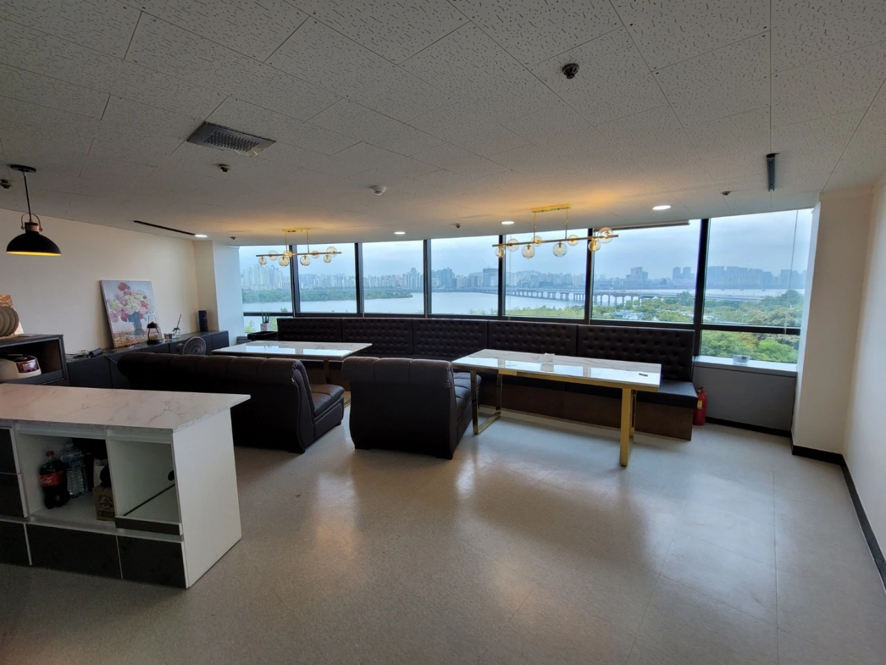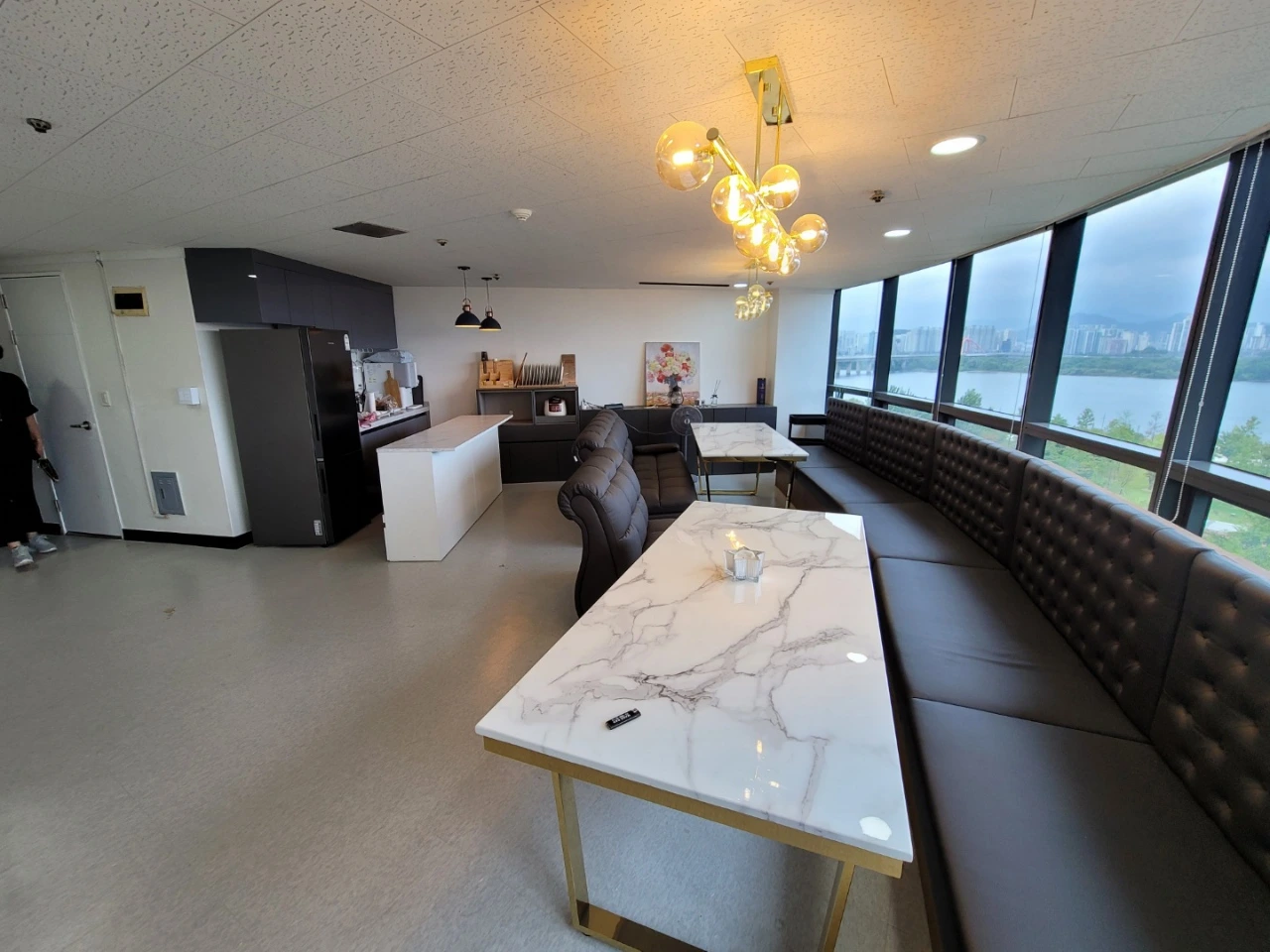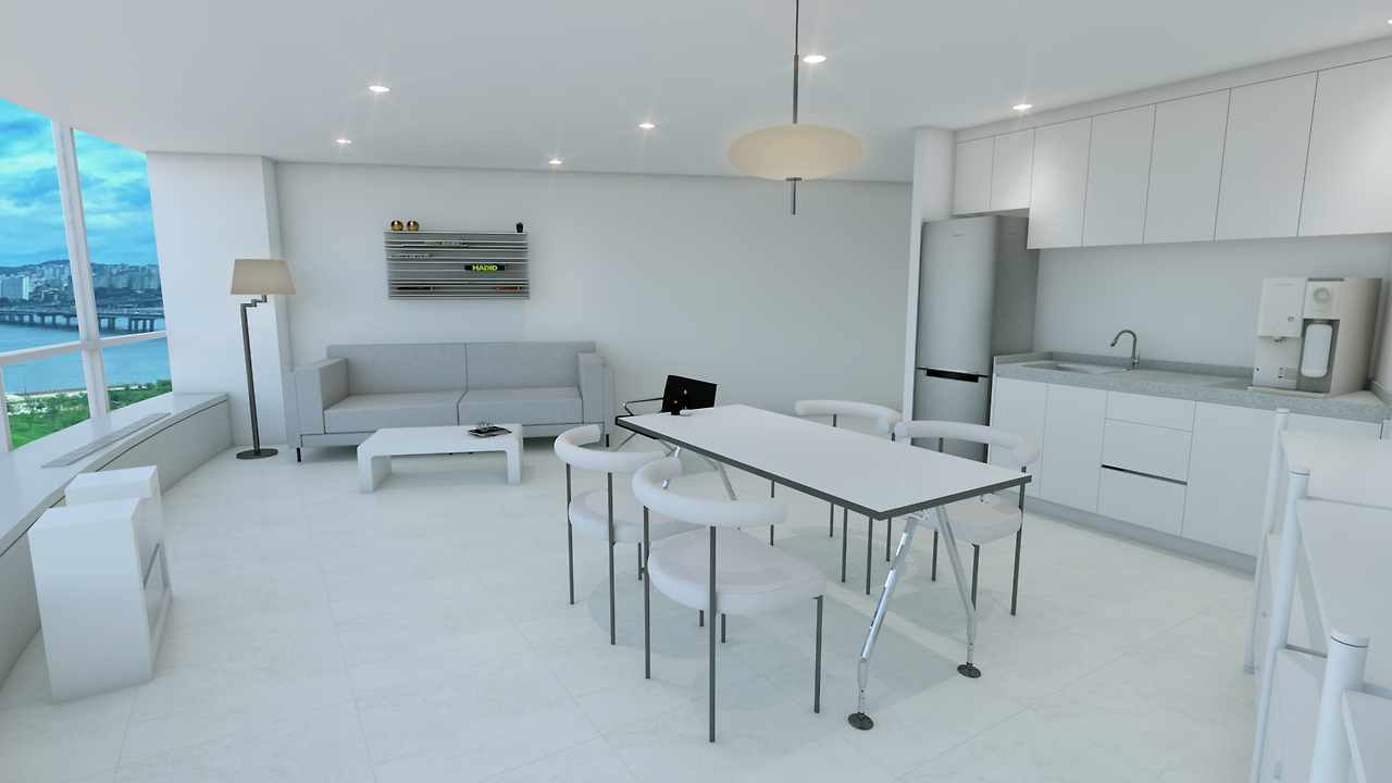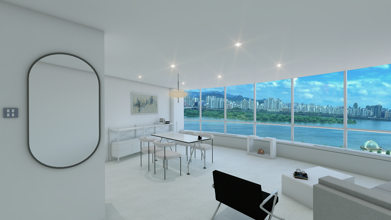 이 인테리어의 포인트는 한강뷰에 포커싱을 맞춰 에탄올 난로를 두어 시선을 최대한 외부로 두었습니다. 실내에 우드를 섞을까, 포인트를 줄까 여러 고민을 하다가 단조롭게 뷰에 집중했습니다. 이 단조로움을 시즌별 소품들과, 다양한 공간에 대한 활용과 스토리로 채워볼까 합니다. 데스크에서는 먹는 것, 그리고 일을 하는 것에 집중했습니다. 소파 섹션에서는 우리가 편히 쉬는 것에 집중했습니다.