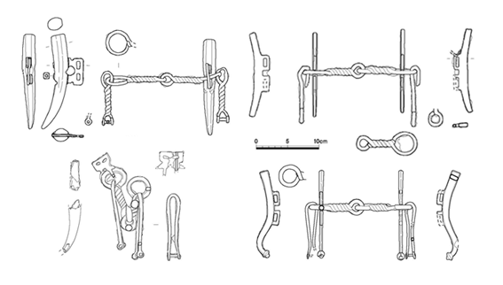 [그림 1]에서 왼쪽의 2점은 골각제의 함유가 한쪽뿐이라도 양호하게 남아 있다. 좌상측의 표비를 보면 녹각 즉 사슴뿔에 금속의 굴레걸이, 즉 입문용금구를 박아넣은 모습이 확인되는데, 이것은 확실히 저번에 제시했던 데레이프카의 함유보다는 한층 발전된 모습이라고 할 수 있다. 실물은 [그림 2]를 참고하면 된다. [그림 1] 오른쪽의 2점과 [그림 2] 오른쪽 재갈은 함유가 온전히 남아있는 편인데, 이것들은 쇠로 골각제 함유의 형태를 본따 만든 것으로 생각된다. 즉 형태적 아이디어는 그대로 가져가면서 재질만 다른 것으로 교체한 것이다. 이것은 사실 인류의 물질문화에서 종종 확인되는 양상이다.