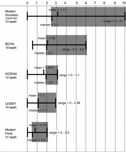 [표 1]은 말의 치아마모도를 비교한 통계자료(David W. Anthony·Dorcas R. Brown 2011)이다. 위에서부터 현대의 가정사육마, 보타이유적 출토 유골, 인도 코자이유적 출토 유골, 미국 플로리다 레이시유적 출토 유골, 현대 방목사육마로부터 각각 치아를 얻어 조사했다. 이에 따르면, 당연한 결과겠지만 금속재갈을 쓰는 말의 치아가 가장 많이 마모되었으며 방목한 말이 가장 적은 마모도를 보인다. 표를 보면 유적에서 출토된 치아들 중에서는 보타이유적의 것이 가장 심하게 마모되었다.
