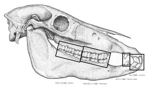 말의 구강구조를 살펴보면, 앞니와 어금니 사이에 큰 공간이 있음을 확인할 수 있다. 이를 치극, 혹은 치간이개 등으로 부르고 사람들은 이 공간에 재갈을 물려 말을 제어한다. 입의 양 끝을 통과한 재갈은 사람이 잡아당기게 되면 말의 입 안을 비집고 들어가 혀 안쪽의 삼차신경을 자극하게 된다. 이때 가해지는 자극은 고통을 가하는데, 이것을 삼차신경통이라고 하며 동물에게 있어 가장 고통스러운 증상 중 하나이다. [그림 3]에서 확인할 수 있듯이 삼차신경에 강한 압력을 받은 말은 이를 떨쳐내기 위해 혀로 끊임없이 재갈을 밀어내게 되고, 이 과정에서 말의 어금니는 딱딱한 재갈에 쓸려 마모되는 현상이 일어나는 것이다.