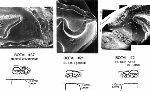 그런데 보타이유적에서 출토한 말의 유골과 배설물, 마유가 담겼던 토기 등은 어디까지나 말 사육에 관련한 흔적들일 뿐이다. 그러니까 이것들을 가지고 기마문화가 있었다고 단정할 수는 없는 일이다. 다만 말의 유골 중에서 치아에 남은 독특한 흔적으로부터 인류가 말을 부렸던 증거를 찾고자 한 시도가 있어 소개하고자 한다. 데이비드 안소니David W. Anthony와 도르카스 브라운Dorcas R. Brown에 의해 이루어졌는데, 그들은 현대 승마용 말의 치아와 보타이유적 출토 말 유골의 치아를 비교하여 인간이 말을 사육했던 흔적을 찾아내었다.