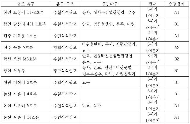 [표 1]의 분류안에 따라 한반도 남부와 일본에서 출토된 원환비를 분류하면 위 [그림 8]과 같다. 기본적인 형태는 다 비슷하게 생겼지만, 제작 방식이나 부속 형태의 차이에 따라 분류가 이루어지는 형식학적 정리가 이해되는가? 이러한 분류를 통해 어느 단계에 정확히 어떤 형태의 물건이 제작 및 사용되었는지를 알 수 있다. 이를 ‘편년’이라고 하는데, 아쉽게도 원환비는 그 이용 시점이 모두 중복되는 것으로 파악되기 때문에 형식학적 관점에서 이루어지는 편년연구의 사례로 들 수는 없을 것 같다. 자세한 내용은 아래 [표 2]를 보면서 소개하겠다.