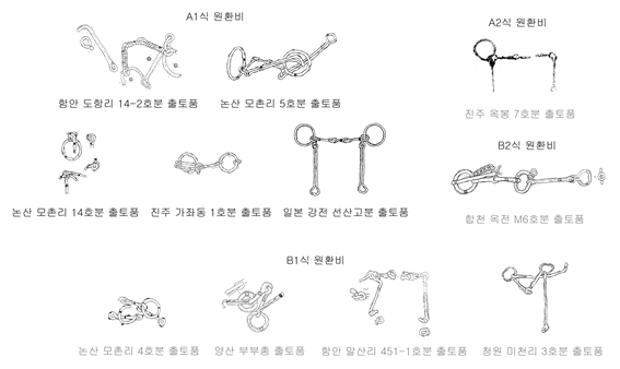 [그림 2]는 가야 고분에서 출토한 환판비들이며, 왼쪽 위에서 오른쪽 아래 방향으로 시기적 선후관계가 나열된다. 비교적 늦은 시기의 재갈인 합천 옥전 M2호분 출토품과 고령 지산동 45호분 출토품은 위의 세 재갈과 비교했을 때 유환이 없다는 점이 특징이다. 즉 유환의 유무를 통해서도 비교적 이른 시기의 재갈과 늦은 시기의 재갈을 구분할 수 있다. 환유의 추가는 곧 유연성의 강화로 이어지므로 더 개발된 제품이라 할 수 있겠다.