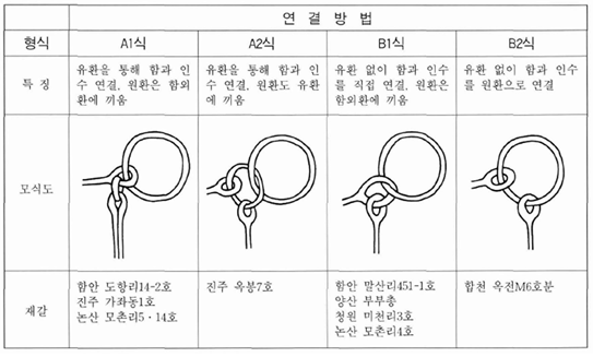 [표 1]의 모식도에서 가장 큰 고리가 원환비의 함유이며, A2식 모식도의 중간 크기 고리가 유환이다. 함과 인수가 유환을 통해 연결되는 것이 A식, 유환이 없는 것이 B식이다. 세부 분류 요소는, 유환의 유무와 별개로 인수와 함유가 연결되지 않는 것이 1식, 연결되는 것이 2식이다. 이것들을 모두 적용하면 [표 2]와 같이 총 4개의 분류가 나오게 되는 것이다. 이 중 [그림 4]의 말이 착용한 재갈은 B2식이며, 사진 속 재갈은 A2식으로 생각된다.
