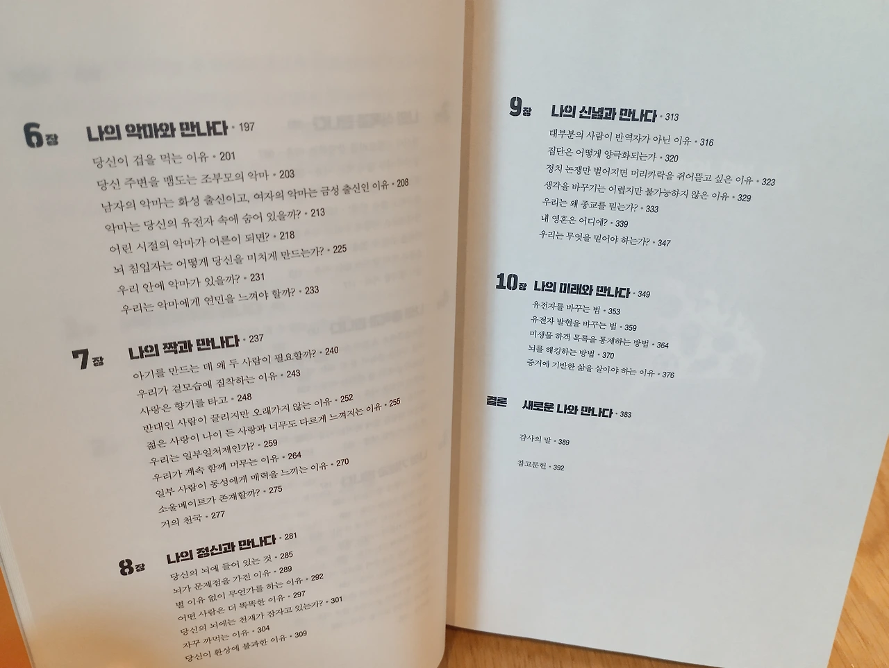 이 책은 단지 소재만 광활한 것이 아니다. 특정 소재를 바라보고 설명하는 방식도 무척 다양하다. 뇌과학, 생리학과 신경학, 후성유전학등등 현대의 최신 생물학 분과를 통해 '나'에 대해 다룬다. 유전자나 뱃속 미생물, 환경등을 통해 사람이 어떻게 범죄자가 되는지, 우리가 식탁에 어떤 반찬을 놓을지 따위를 설명한다고 보면 된다. 이런 점에서 이 책은 상기의 명제에 입각하여 쓰였다고 할 수 있다.