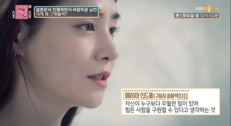 최근 「연애의 참견」이라는 프로그램에서 흥미로운 연애스토리가 방영되었다. 해당 방송에서는 누가 봐도 힘든 연애였지만 여자친구는 끝까지 부족한 남자친구를 포용하고 보듬어주려는 노력을 하지만 그러다가 남자친구가 바람을 피는 장면을 목격하게 되는 주인공의 연애 고민이 방영되었다. 그 영상을 보며 곽정은은 '메시아 신드롬'이라는 심리학 용어를 사용해 이슈가 되기 했다.(Messiah Syndrome)