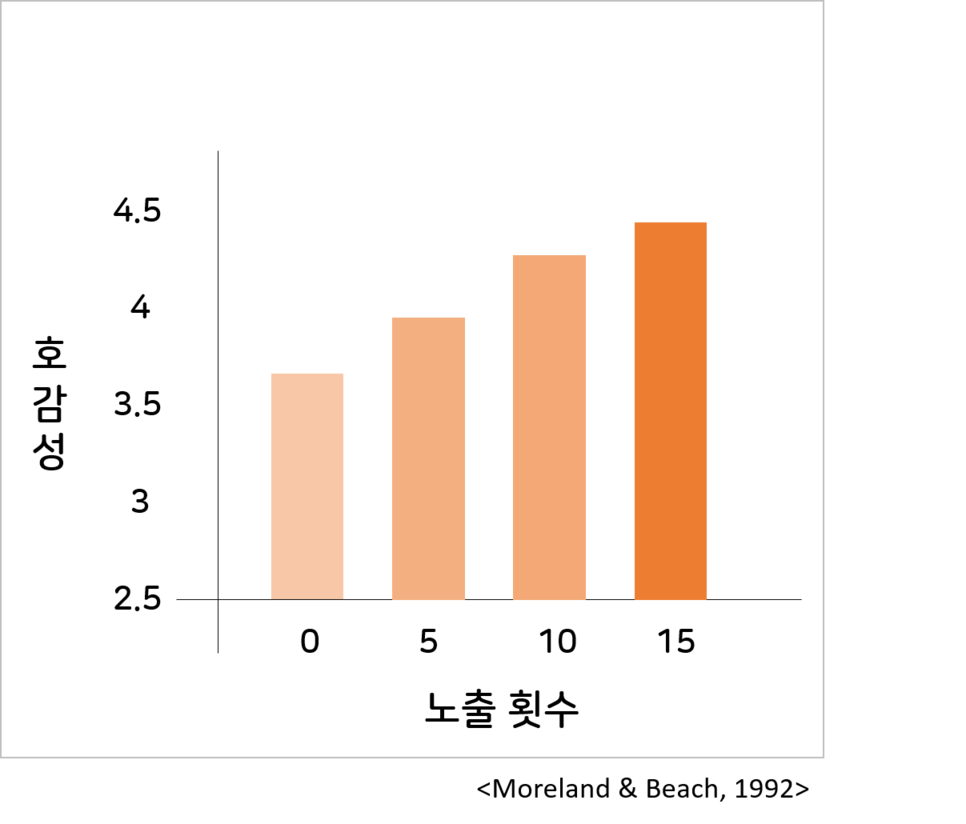 일반적으로는 우리가 잘 알고 있는 대로 '단순한 반복노출이 호감을 증가시킨다'는 단순노출효과(Zajonc, 1968)에 의해서 자주 본 사람에 대해 긍정적인 태도를 갖게 된다. 한 대학에서 재미있는 연구가 진행되었다.(Moreland & Beach, 1992) 매력도가 비슷한 4명의 여학생을 노출빈도를 0, 5, 10, 15번으로 다르게 하여 맨 앞자리에 앉아 수업을 수강하도록 했다. 학기가 끝날 때 함께 수업을 들었던 학생들에게 이들의 얼굴을 보여주고 매력도와 호감도를 평가하게 하자 노출 빈도가 많을수록 더 긍정적인 평가가 나타났다(우측 이미지 참조).