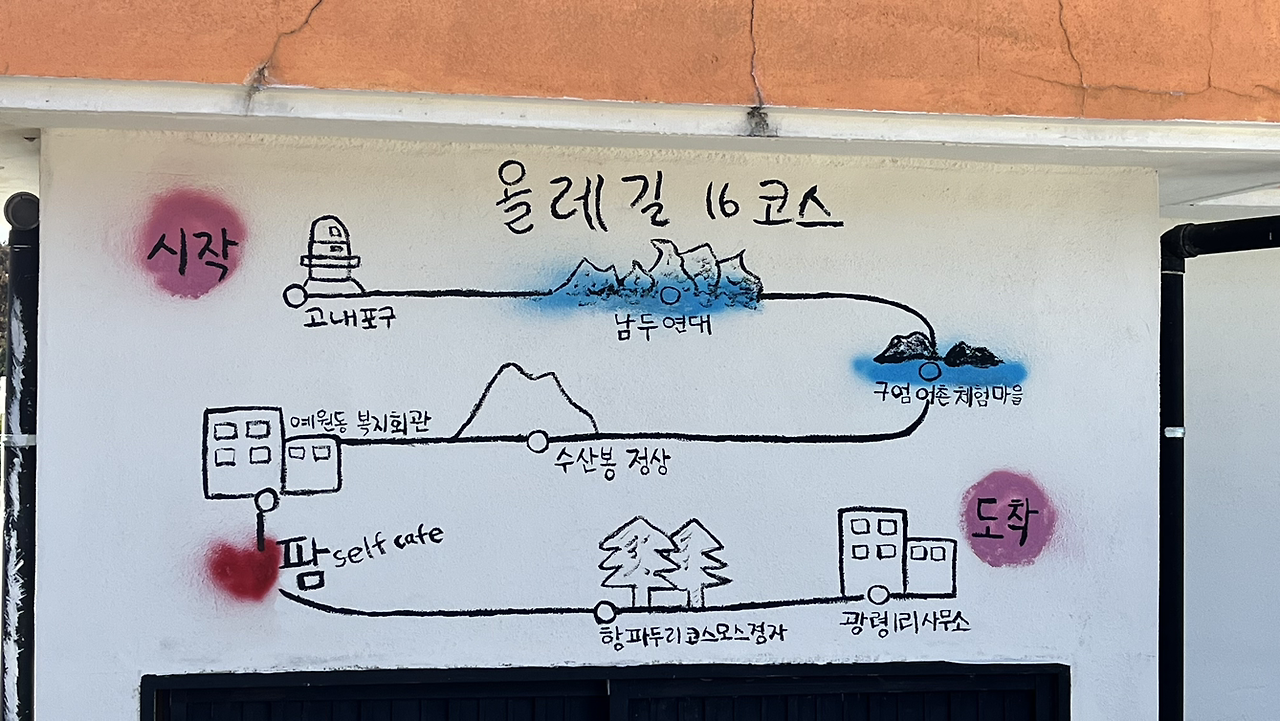 이틀을 걸었더니 발바닥도 다리도 아프다. ‘소파에 앉아 드라마나 보다가 맛집 탐방이나 할까?’ 게으름이 몽글몽글 올라온다. 걷기는 즐거우면서도 힘들다. 집 밖으로 나가기가 힘들어서 그렇지 막상 나가서 걷기 시작하면 잘했다 싶어지는데도. 오늘은 숙소가 있는 올레길 16코스를 걷는다. 어제는 멀리 성산포까지 가서 1코스를 걸었는데, 오가는데 시간이 많이 걸려 계획을 좀 바꾸었다.
