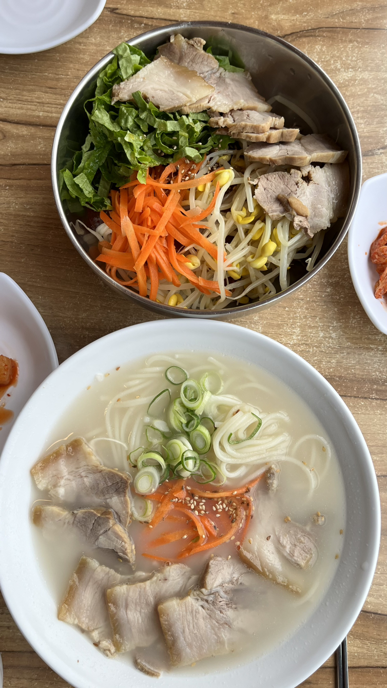 늦은 점심은 지난번에 검색해 둔 맛집 <꽁순이네>의 고기국수(8,000원)와 비빔국수(8,000원)다. 돔베고기(小 17,000원)를 꼭 먹어 보고 싶었는데, 국수에 고기가 들어있다고 해서 국수만 주문했다. 일반 국수의 소면보다 더 굵은 중면으로 요리했는데, 면발이 탱글탱글하고 고기는 졸깃하고 고소하다. 설렁탕 국물 같은 육수는 연한 멸치맛에 고기맛이 절묘하게 어우러졌다.