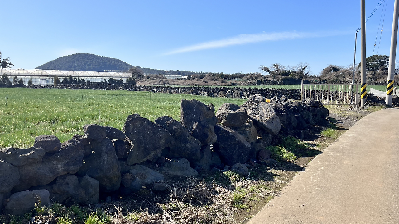 길을 따라 걸으면 현무암 돌담으로 경계 지어진 밭과 드문드문 있는 집들 그리고 바람을 만난다. 코스 중간 지점까지는 오로지 그것뿐이다. 2km 지점에 큰 카페(그린 페블)가 있는데, 왠지 생뚱맞다. 돌담과 바람뿐인 여기까지 사람들이 차를 마시러 찾아올까? 안내 책자에는 중간에 큰소낭숲길, 오시록헌 농로, 굴렁진 숲길이 있다고 하는데 큰 기대는 하지 않는 게 좋다.