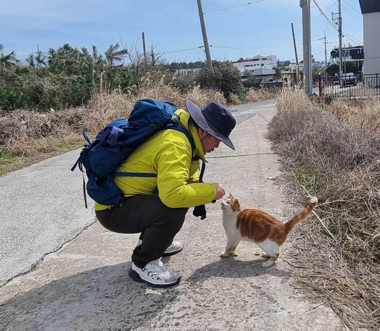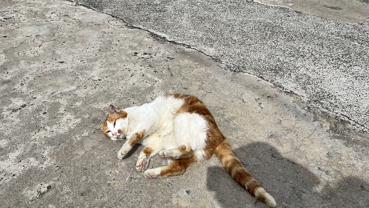 한참 지루할 즈음, 어디서 냥이가 야옹야옹 울면서 뛰어온다. 제 집사가 돌아오는 마냥 반긴다. 볼록한 배를 보니 배고픔 때문은 아닌 것 같고, 사람이 그리웠던가? 혹시나 하고 배낭에서 삶은 달걀을 꺼내 주니 조금 핥고 만다. 소시지라도 하나 가져왔으면 좋았으련만... 햇살이 좋은지, 사람이 반가운지 배를 드러내 놓고 길에서 뒹굴뒹굴하며 같이 놀자고 보챈다. 강아지 마냥 한참을 따라 내려오다 돠돌아간다. 집에 두고 온 팬서와 짱아는 나를 그리워하고 있을까?