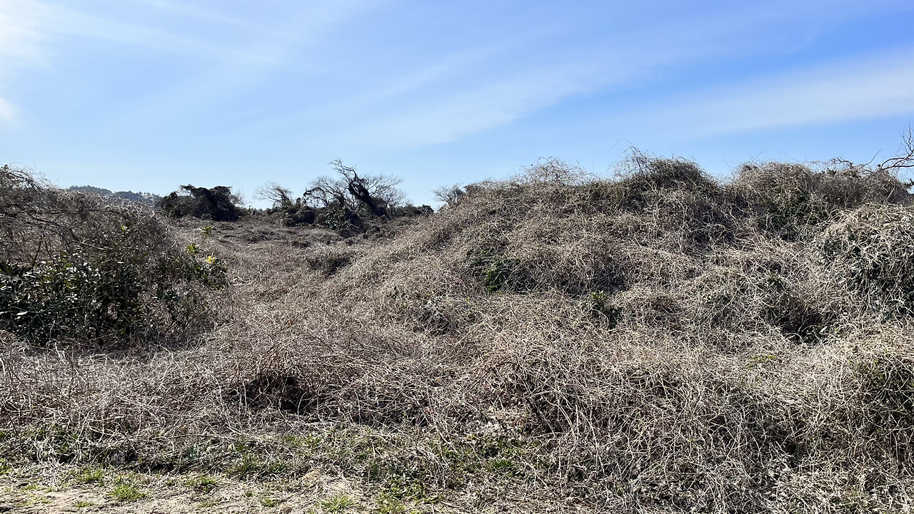 감귤밭, 마늘밭, 대파밭이나 천혜향을 재배하는 비닐하우스가 아닌 곳은 나무와 수풀이 제법 울창하나 칡덩굴이 모두 집어삼킨 모양새다. 도시의 고속도로변과 강가의 수풀도 마찬가지 형국인데 이곳 제주의 숲도 다르지 않다. 햇살이 따뜻해지면 저도 싱싱한 수풀인 양 하겠지만, 회색빛 칡덩굴이 뒤덮인 숲의 모습은 을씨년스럽다.