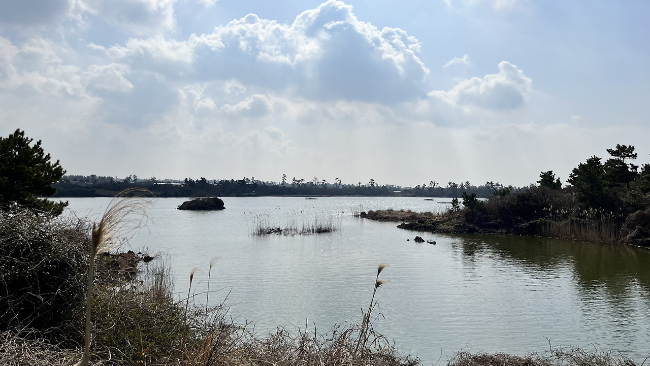 어느덧 용수저수지 입구다. 가축방역초소와 출입금지 팻말이 눈에 띈다. 조루인플루엔자 확산 우려로 코스가 임시로 변경되었다고 올레패스에 안내되어 있는데, 길은 용수저수리 왼쪽으로 이어진다. 길을 따라 걷다 저수지의 풍경이 좋아 벤치에서 잠시 쉰다. 14-1코스에는 올레길을 걷는 사람을 위한 벤치 하나 없어 아쉽다고 지난 글에서 투덜거렸더니 벌써 벤치를 가져다 놓은 모양이다. 공무원들이 이렇게 빨리 움직일 리가 없는데.... 13코스에는 이곳 말고도 서너 군데 벤치가 있다.