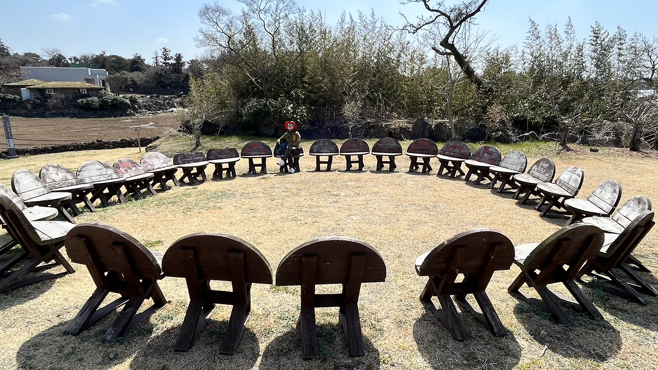 힘겹게 올라, 정상둘레길을 한 바퀴 돌고, 분화구 구경은 아픈 무릎을 핑계로 다음으로 미루었다. 계단을 조심조심 다시 내려와 시원한 둘레길을 따라 13, 14코스의 종착점이자 14-1코스의 시작점인 저지예술정보화마을로 내려왔다.