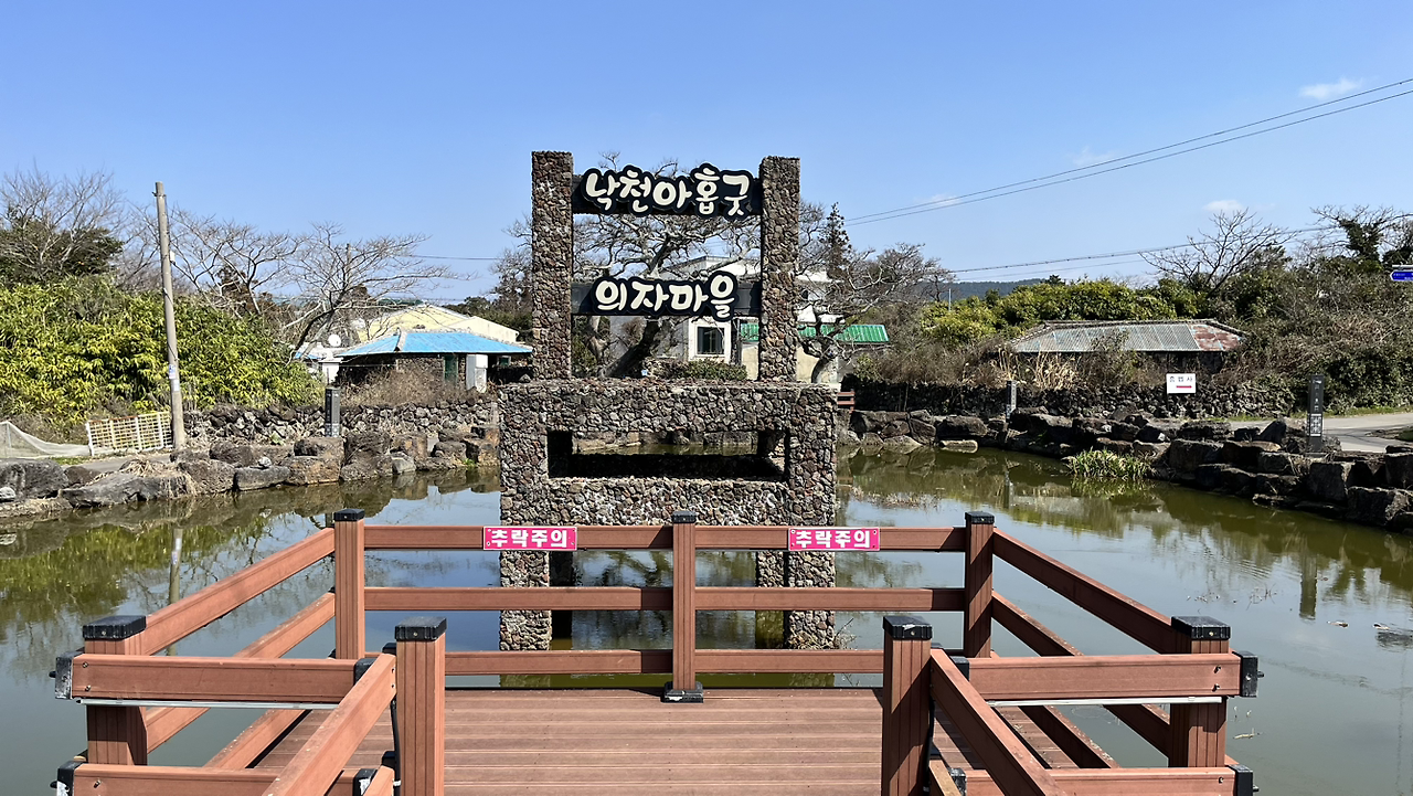 9km 정도를 걸으면 수령이 120년이 넘는 커다란 팽나무를 만난다. 아홉굿 전설이 있는 낙천리 마을이다. 담벼락에 그림이 그려진 곳이 여럿이다. 어느 집 담벼락에는 누군가 이런 글을 새겨 놓았다.