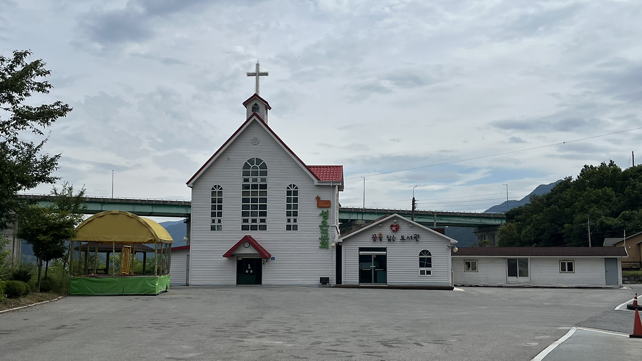 팔괴교를 지나 곧 왼쪽으로 꺾어 걷는다. 맞은편에 빨간 지붕에 하얀 목재 외벽을 가진 <성은교회>가 있고 옆에는 교회건물보다 낮은 높이의 <꿈을 담는 도서관>이 보인다. 교회와 도서관이라는 그 배치도 건물 외양만큼이나 앙증맞다. 종교를 가지지 않은 나 같은 사람도 교회 문을 열고 들어가 잠시 기도를 드리고 싶어 진다.