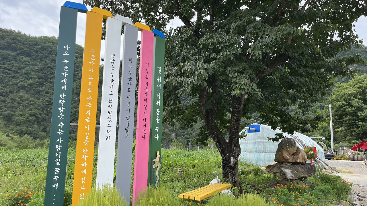 소요시간 5시간 30분을 예상하고 걸었는데, 각동리 마을 올라가는 길에 내려서기까지 6시간 55분이 걸렸다. 3시 54분 버스는 떠난 지 오래다. 다음 버스는 3시간 뒤 6시 54분에 있다. 각동교를 건너 버스정류장 표지판도 없는 정류장에 서서 히키하이킹을 시도했다. 참 오랜만에 해보는 짓이다.
