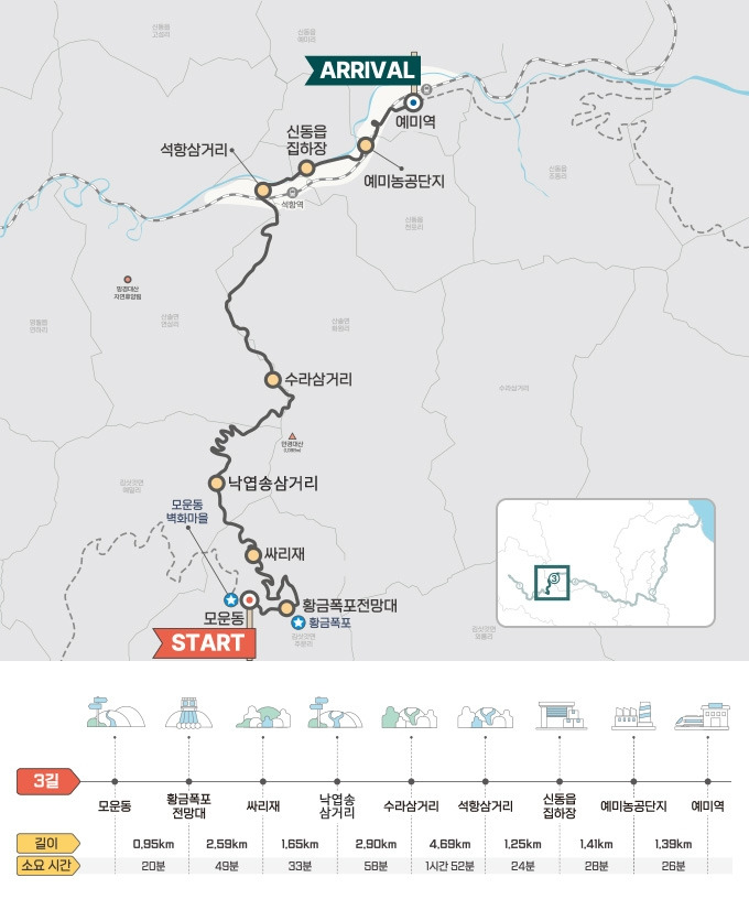 [3길 트레킹] 모운동(10:40)-황금폭포 전망대-싸리재-만봉사갈림길-수라삼거리-석항삼거리-신동읍 집하장-예미농공단지-예미역(16:30)
