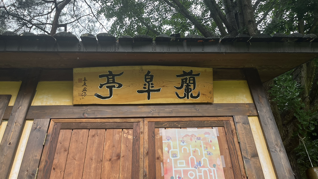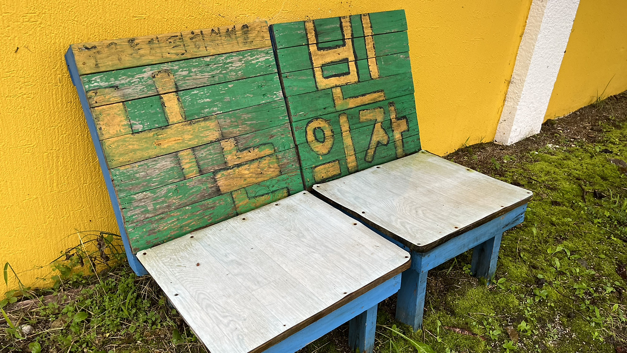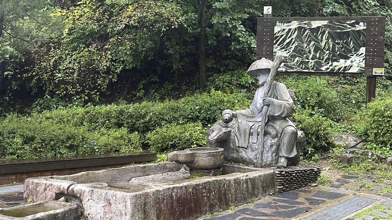 모운동으로 다시 내려와 마을 쉼터 정자에서 바라보는 ’운탄고도 마을호텔‘이 참 이쁘다. 샛노란 벽이 비 오는 날에 잘 어울린다. 문 옆에는 tvN에서 2022년 8월부터 10월까지 8부작으로 방영한 <운탄고도 마을호텔 1>의 출연진인 엄홍길 대장, 배우 정보석과 이장우의 모형 사진이 서 있다. 손님을 즐겁게 맞이하듯 엄대장을 팔을 활짝 펼치고 있고, 정보석과 이장우는 두 손을 곱게 모으고 살짝 허리를 굽혀 다정한 미소를 보낸다.