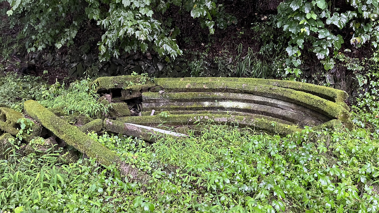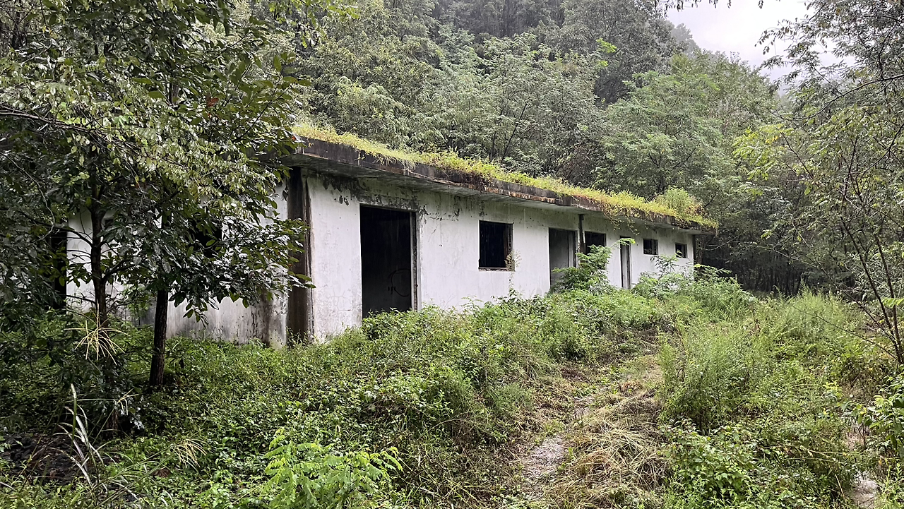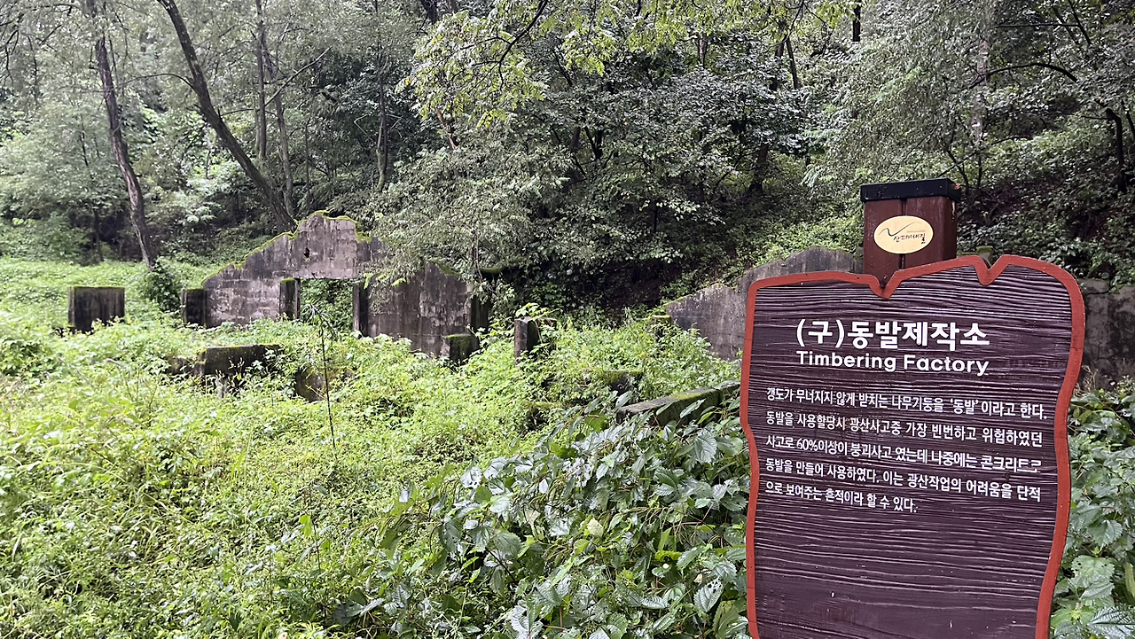 벽화마을(벽화마을이라고는 하지만 두 어채 담벼락에 그림이 있는 정도)을 지나 트레킹을 시작한다. 비는 오지만 공기는 상쾌하고 기분은 좋고 발걸음은 가볍다. 탄차가 다니던 길이라서 그런지 길도 넓다. 작은 돌이 깔린 길이라 군데군데 물웅덩이만 피하면 걷기에도 나쁘지 않다. 조금 걷다 보니 (구)동발제작소다. 갱도가 무너지지 않게 받치는 나무기둥을 ‘동발’이라고 하는데 이곳이 그 동발을 제작하는 곳이다. 광산사고의 60% 이상이 갱도붕괴로 인한 것인데, 나중에는 나무 대신 콘크리트로 동발을 만들었다고 한다. 제작소의 창문이 달린 벽채와 이끼가 잔뜩 끼인 부서진 콘크리트 동발만이 풀숲에 덩그러니 남았다.