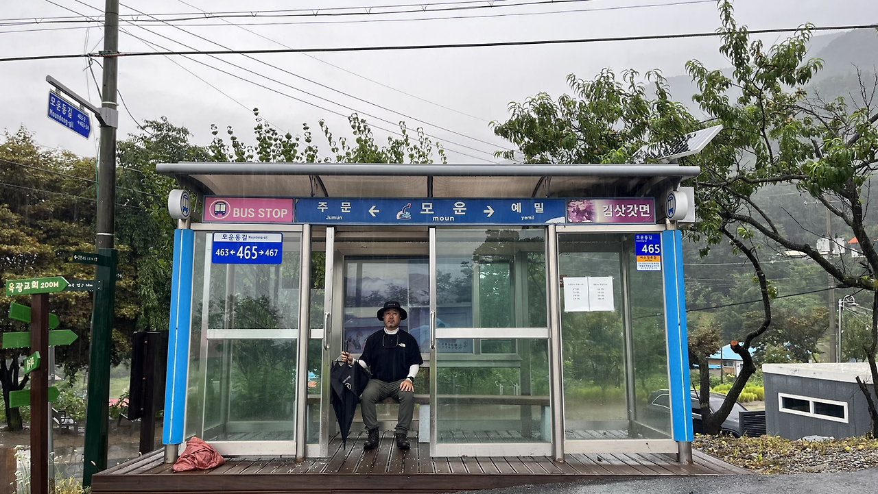 주문교 다리에서 운탄고도 마을호텔이 있는 모운동까지는 5km 거리다. 차를 타고 올라와 보니 걸어서 오기는 힘든 코스다. 아스팔트 포장이 되어 있고, 차가 두 대 지나갈 정도로 넓지만 경사가 제법 심해서 걸으면 2시간 정도는 족히 걸리겠다. 모운동, 구름이 모여 쉬어 가는 마을, 해발 700m가 넘는 곳이다. ‘운탄고도 마을호텔’ 앞에 주차하고 버스 정류장 안에서 가져온 커피를 마신다. 정류장은 의외로 아늑하다. 비와 바람도 막아주고, 전망 마저 좋다. 비 내린 모습을 보며 마시는 모닝 커피, 전망 좋은 카페가 따로 없다. 아직 아침 7시가 안 된 시각, 첫 버스가 막 올라온다.
