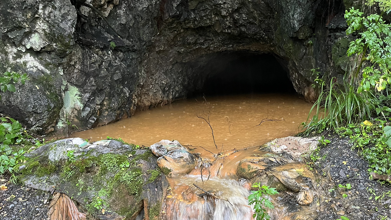 싸리재로 올라가는 갈림길 오른편으로 옥동광업소 갱도 표지판이 있다. 광업소 목욕탕도 있다고 해서 잠시 들렀다. 광부들이 갱도에서 나와 퇴근하기 전에 목욕을 하던, 당시 나름의 직원 복지 시설이다. 지금은 건물 입구부터 풀이 자라 가까이 갈 수도 없다. 목욕탕을 지나니 곧 갱도다. 갱도 앞에는 커다란 물웅덩이가 있고, 갱도는 검고 까마득해서 그 깊이가 짐작이 안된다. 입구 안내판을 보니 갱도의 길이는 2.1km이고 산 반대쪽까지 관통이 되어 있는데 갱도 내부에 맑은 샘이 있어 끊임없이 물이 흘러나온다고 한다. 이 물이 조금 전에 보고 온 황금폭포로 가는 물이다.