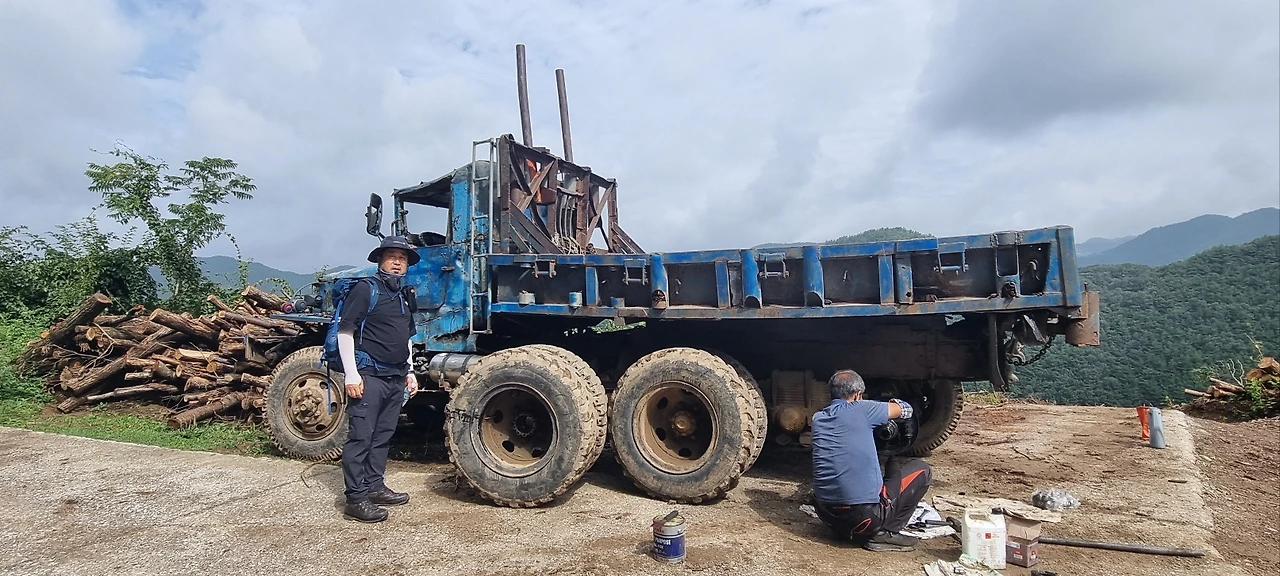 산들의 풍경을 즐기며 걷는데, 나무들이 모두 베어져 나간 벌거숭이 산등성이에서 오래된 파란색 트럭이 서 있다. 누군가 커다란 트럭 바퀴를 빼어 놓고 한참 수리에 열중인데, 가까이 가서 보니 차도 사람도 나이가 많다. 차량의 연식이 얼마나 되었는지 물어보니 67년 산이라고 한다. 나보다 한 살이 많다. 이렇게 오래된 차는 부품이 없을 텐데 어떻게 직접 수리를 하시냐 했더니, 이것저것 가져다가 맞춰서 수리해서 쓴 지 40년이나 되었단다. TV에도 나온 차라며 자부심이 이만저만이 아니다.