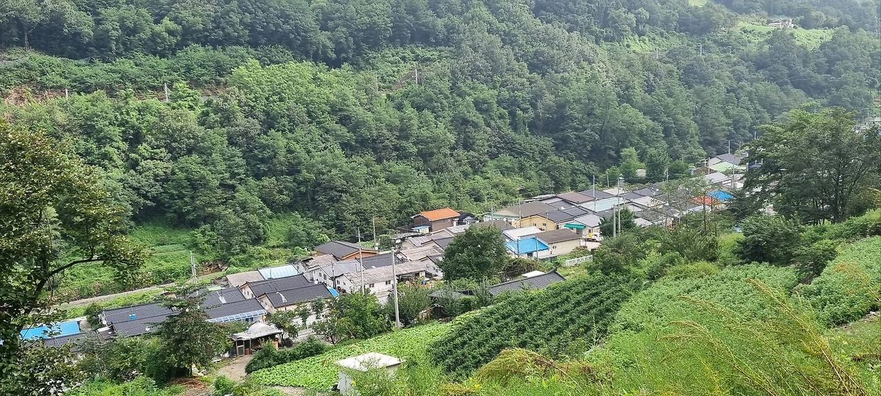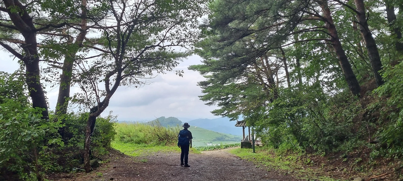 학교를 지나 작은 다리를 건너간다. 왼쪽 아래 철길 옆으로 다닥다닥 이쁜 지붕이 붙은 마을이 보인다. 무슨 사연인지 마을 어느 집 문 앞에 아주머니 한 분이 앉아 채소를 다듬으며 고래고래 소리를 지른다. 상대는 보이지 않는데, 저 소리는 아마 온 동네 사람들이 다 듣지 싶다. 아주머니의 낯선 욕지거리를 들으며 ‘엽기적인 그녀 소나무길’ 초입에 들어선다. 여기서부터 거의 8km가 시멘트 포장 오르막 길이다. 그래도 경사가 급하지 않고 길 좌우로 소나무와 잣나무가 울창하게 서서 햇볕을 가려준다. 점차 고도가 높아지면서 저 멀리 산들이 아래로 아래로 뒤쳐져간다.
