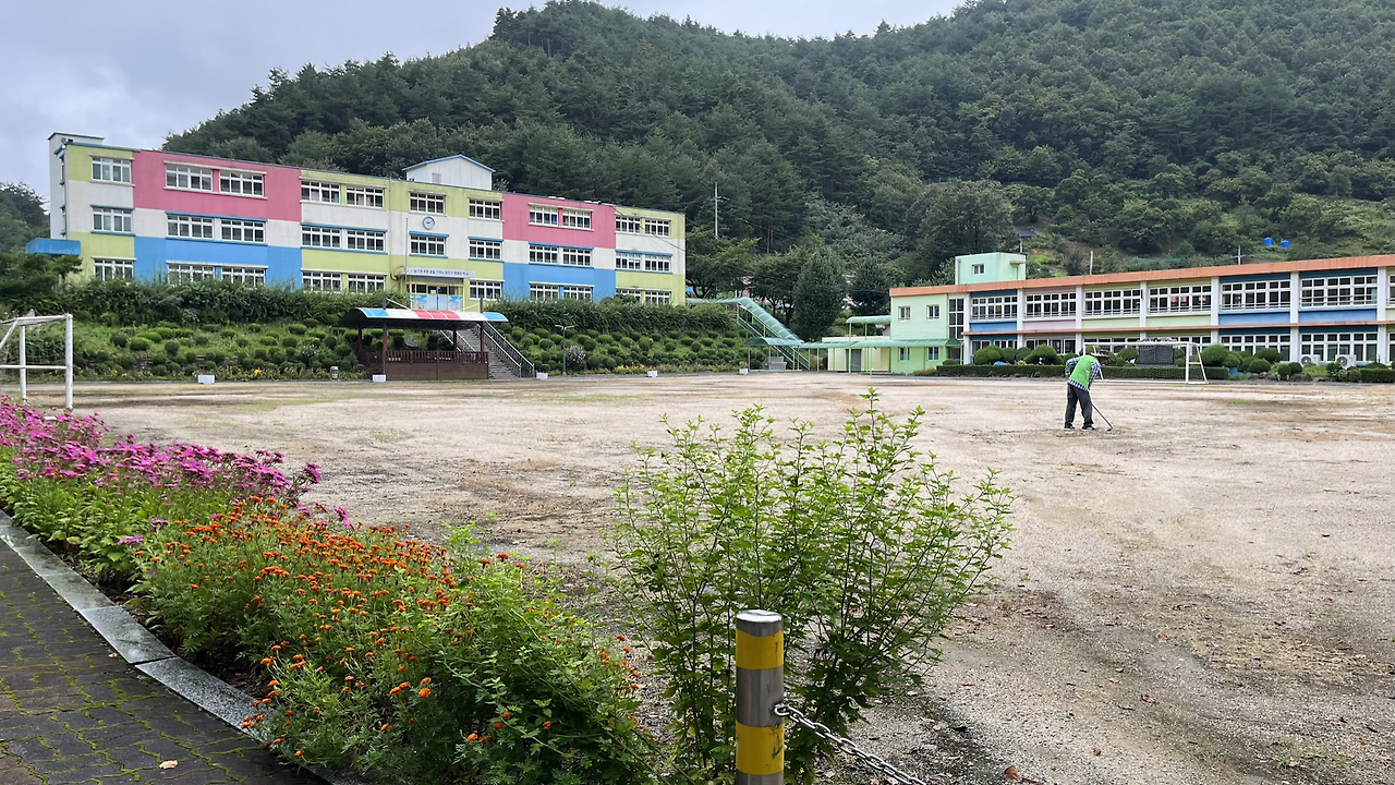 소달초등학교 뒤쪽으로 들어와 운동장이 보이는 조회대 겸 쉼터에 자리를 잡는다. 학교에 사람은 보이지 않고, 정문과 옆문에 차량 출입을 막는 철책이 걸려 있는 걸 보니 폐교된 듯 보인다. 검색해 보니, 1927년 개교, 2021년에 도계초등학교 분교장이 되었다가 2023년 2월 말로 폐교되었단다. 폐교 후에도 관리를 주기적으로 하고 있는지 주인 없는 운동장에 잡풀도 없이 깨끗하다. 심지어 화단에는 꽃도 예쁘게 피어 있다.(시니어 클럽에서 주기적으로 청소 등 관리를 한다고 한다.)