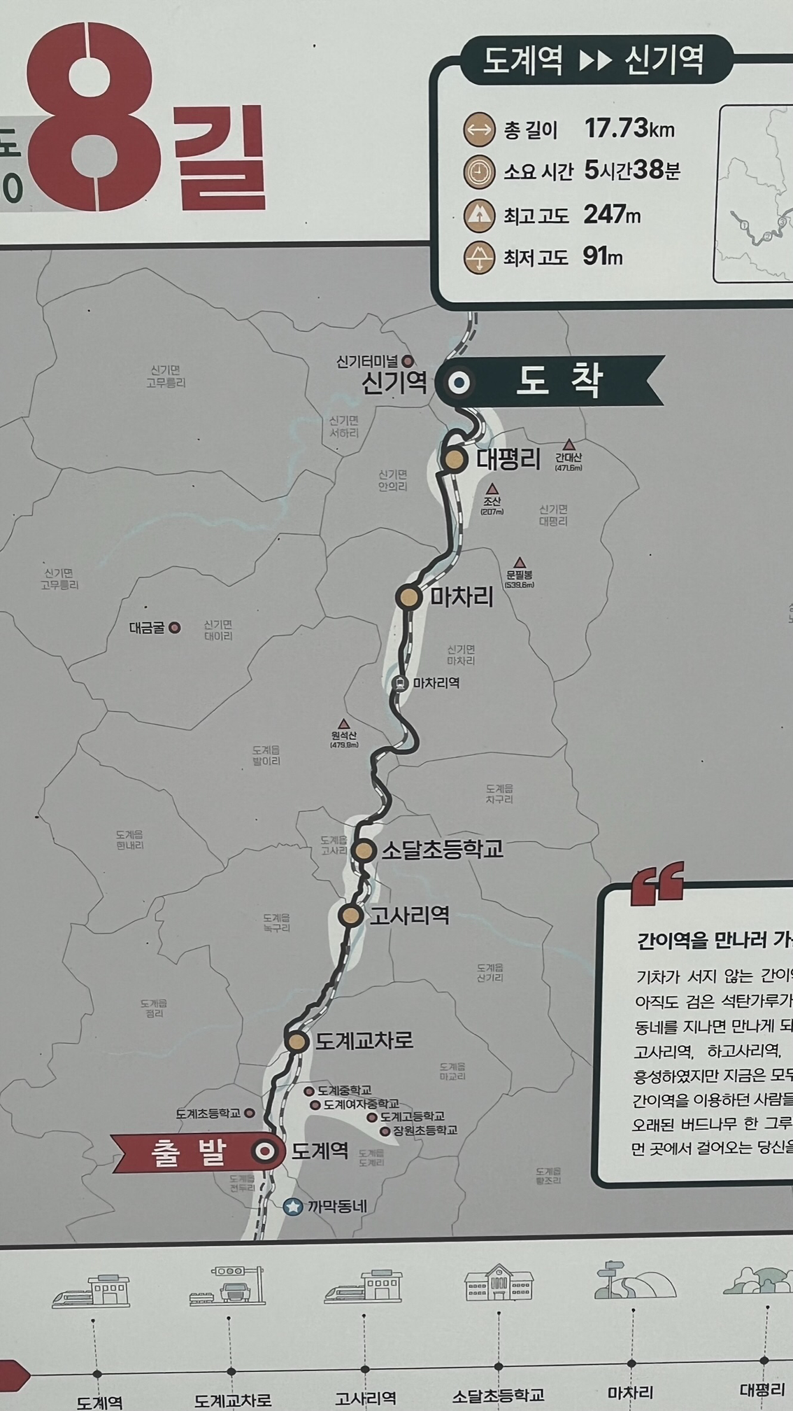 - [8길 트레킹] 도계역(9:00)-도계교차로-고사리역-소달초등학교-마차리-대평리-신기역(15:00)
