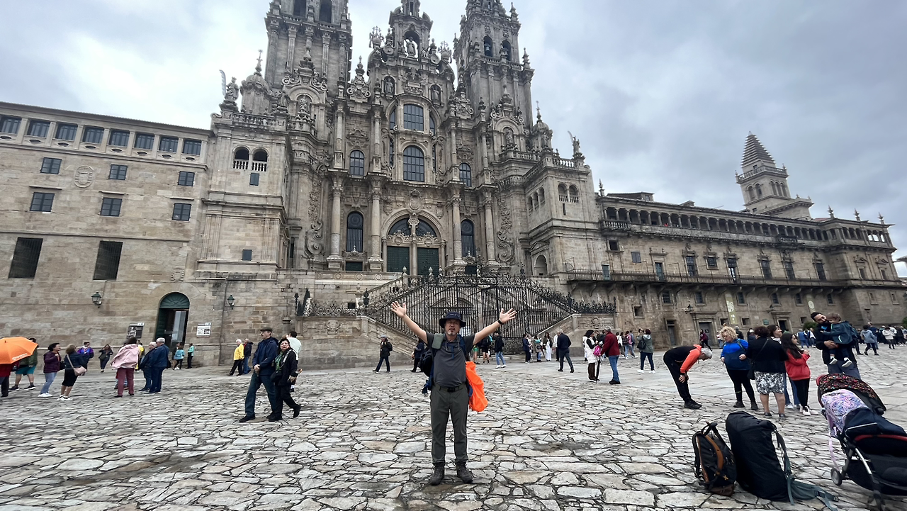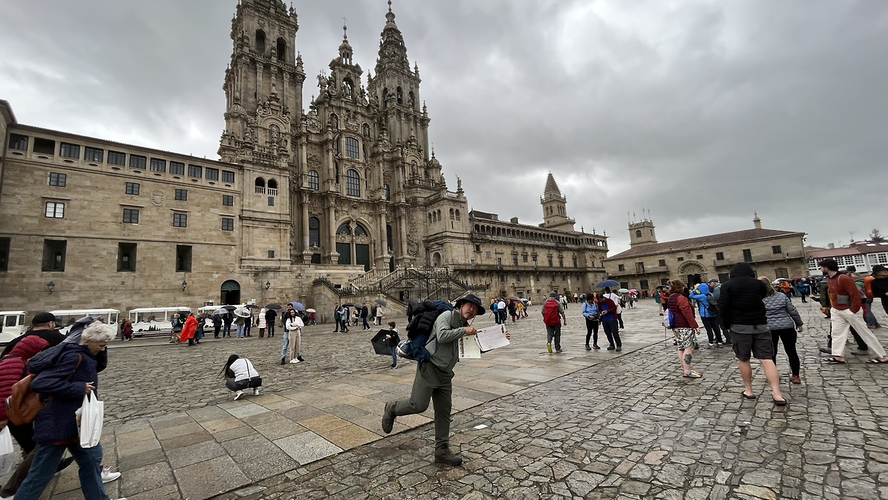 대성당의 광장으로 가는 길은 성당 뒤에서 오른쪽으로 돌아 들어간다. 벌써 많은 사람들이 광장에 모여서 기쁨을 만끽하고 있다. 가만히 서서 눈물을 흘리는 이, 같이 걸은 동행자를 끌어안고 감격에 겨워하는 이, 배낭을 배게 삼아 누워서 대성당의 웅장한 모습을 올려다보는 이, 기념사진을 찍고 찍어주고, 완주를 축하하는 이들.