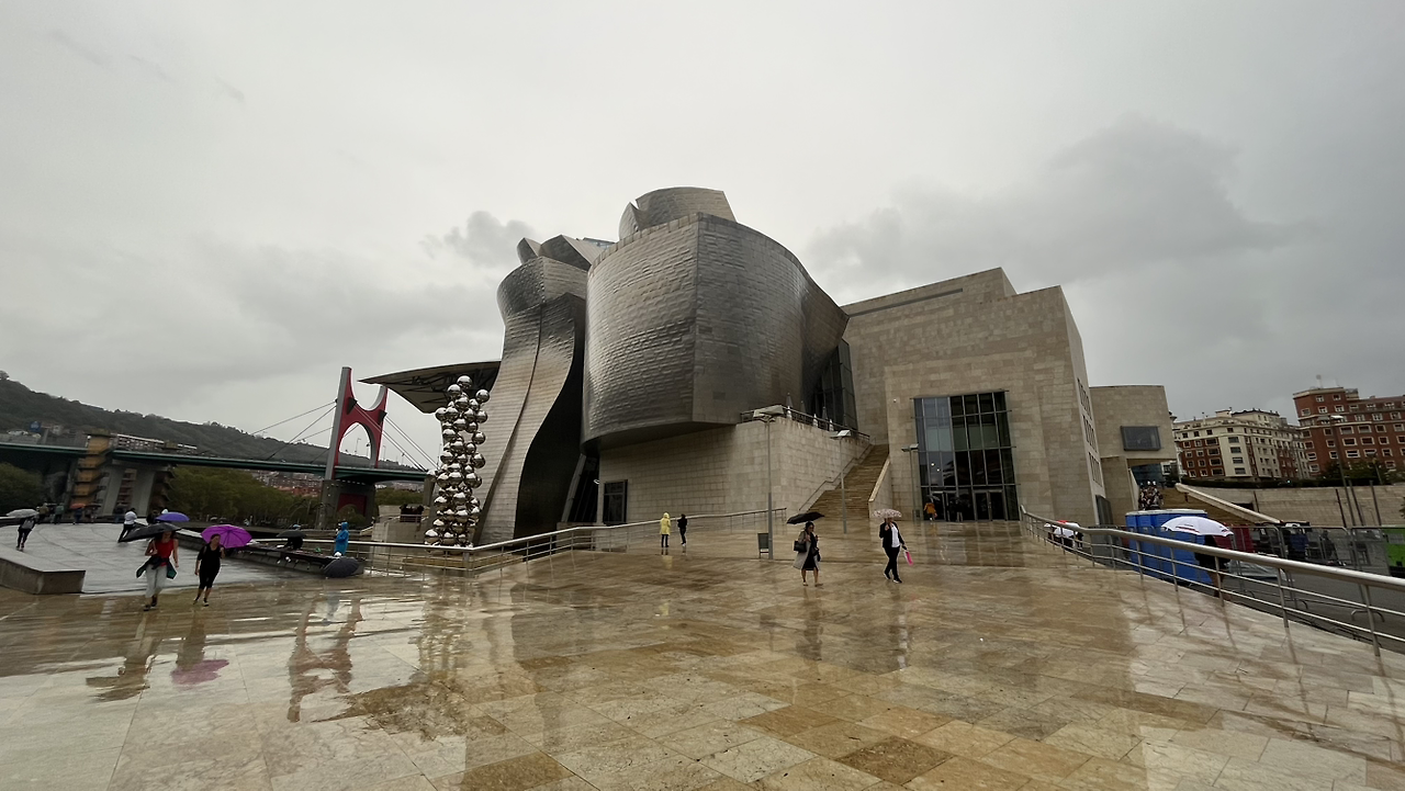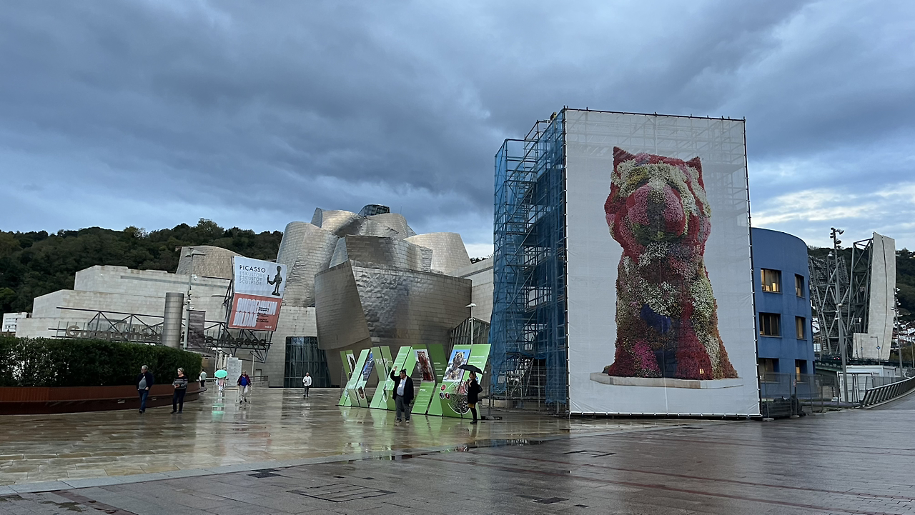강 쪽이 미술관의 뒷면이고 정문은 반대쪽에 있다. 오른쪽 계단을 따라 올라가도 되고, 왼쪽에 있는 다리(Puente la Salve)로 올라갈 수도 있다. 다리 쪽으로 올라가면 건물을 전체적으로 조망하기 좋다. 다리 아래쪽으로도 미술관 건물이 들어와 있고, 다리 상판과 아주 가까워 건물을 다리 아래로 욱여넣은 느낌마저 든다. 비정형의 미술관 모양 때문에 더 그런 생각이 드는 모양이다. 정문 쪽에는 세상에서 가장 이쁜 강아지라는 찬사를 받는 제프 쿤스(Jeff Koons) 작품, 퍼피(Puppy)가 있는데, 아쉽게도 몸단장 중이다.
